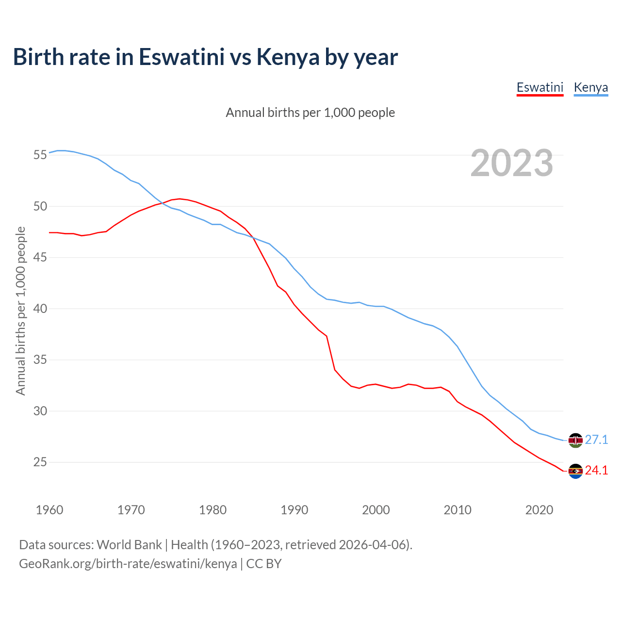 According to the latest available data on birth rates, the fertility rate in Eswatini was 2.75 children per woman in 2023, compared to 3.21 in Kenya in 2023. The replacement level is considered to be 2.1 children per woman.
