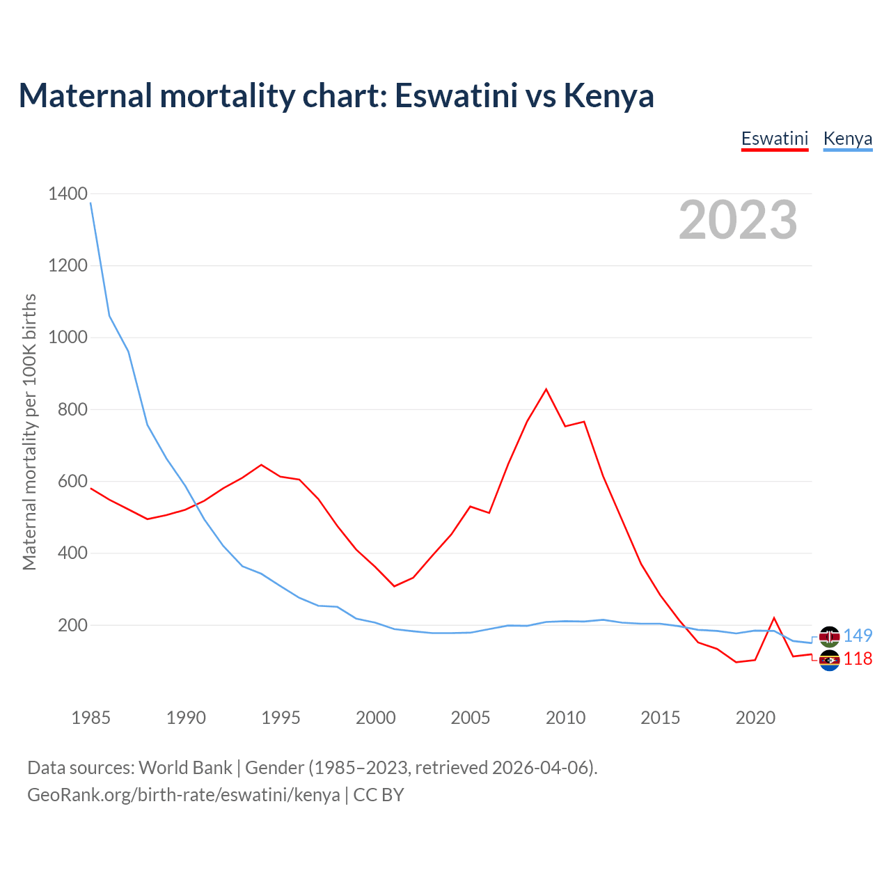 The maternal mortality rate, which is the probability of dying during childbirth or within 42 days of pregnancy termination, is 118 deaths per 100,000 live births in Eswatini, compared to 149 deaths in Kenya.