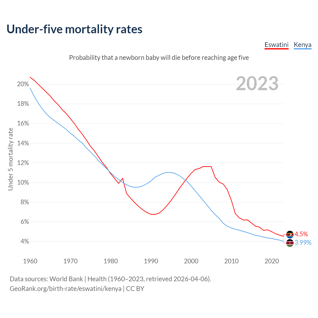 The chance that a newborn baby will die before reaching age five is 4.5% in Eswatini and 3.99% in Kenya. Above is a chart with historical data on under-five mortality rates.