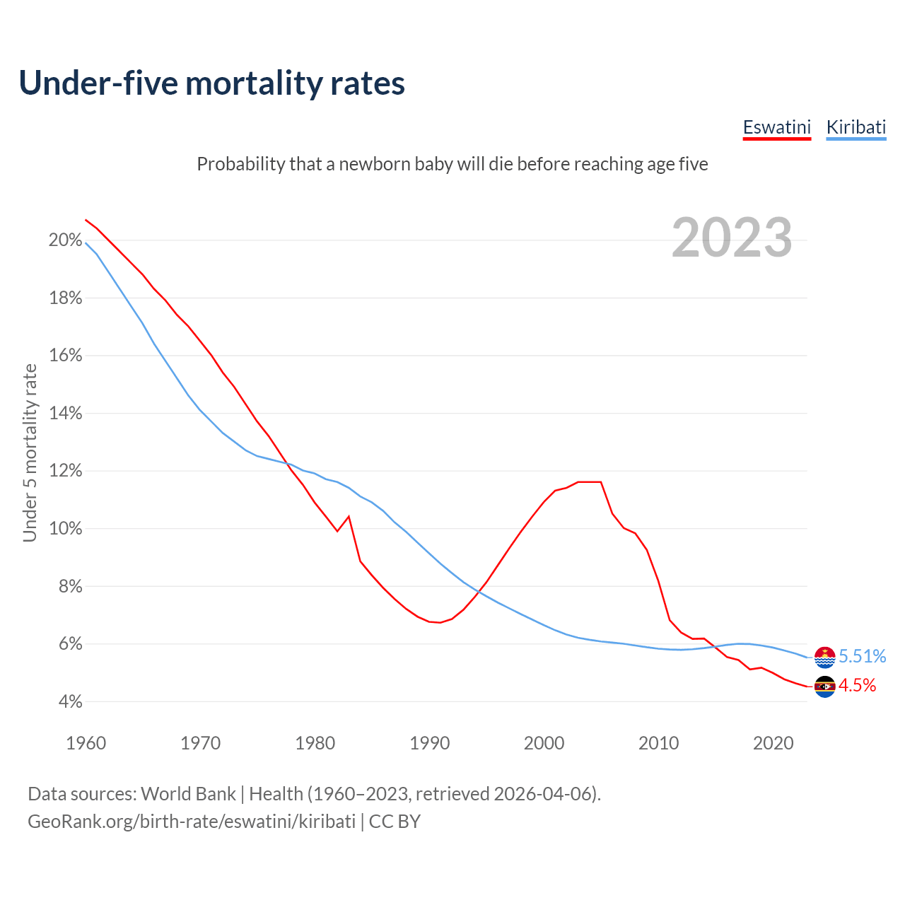 The chance that a newborn baby will die before reaching age five is 4.5% in Eswatini and 5.51% in Kiribati. Above is a chart with historical data on under-five mortality rates.