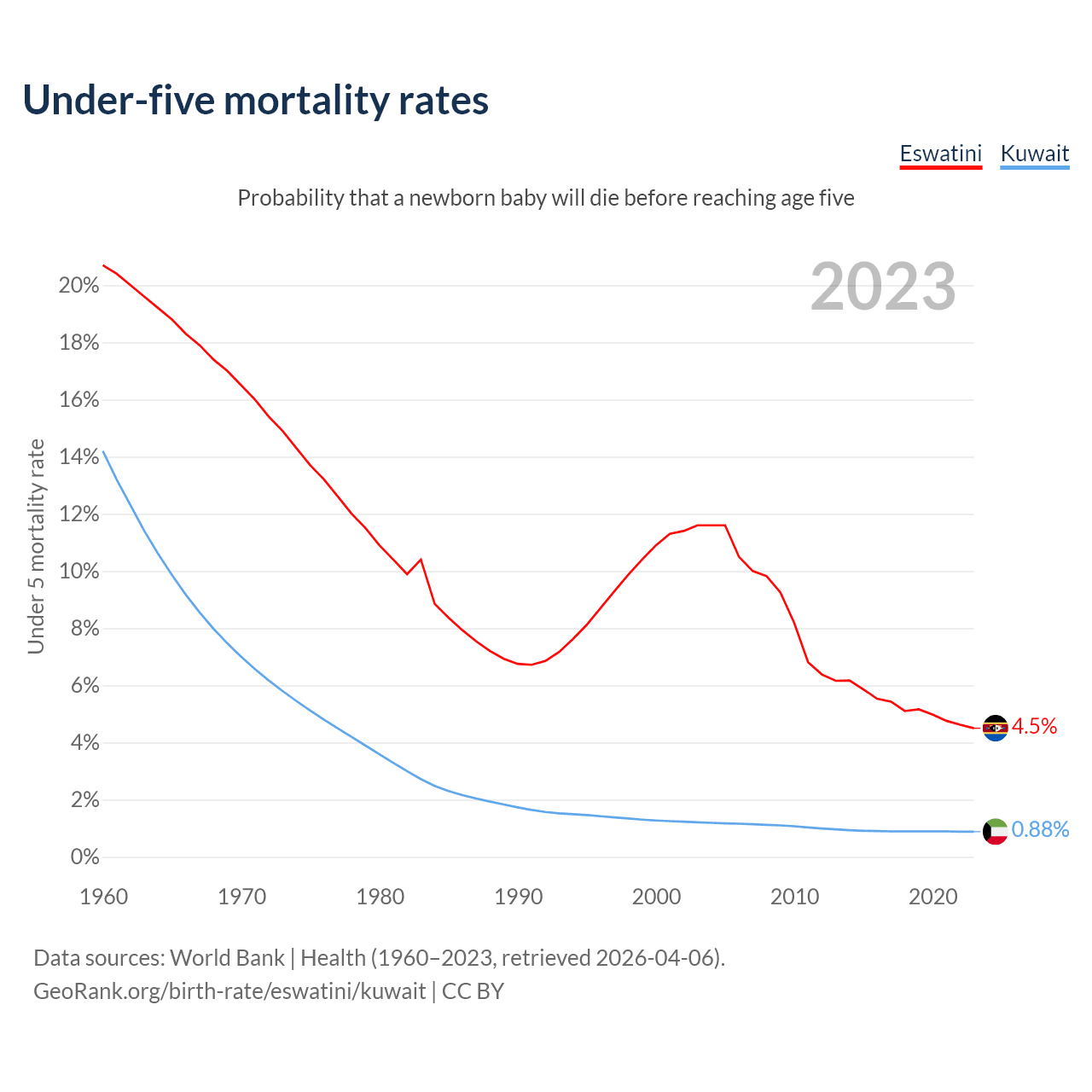 The chance that a newborn baby will die before reaching age five is 4.5% in Eswatini and 0.88% in Kuwait. Above is a chart with historical data on under-five mortality rates.