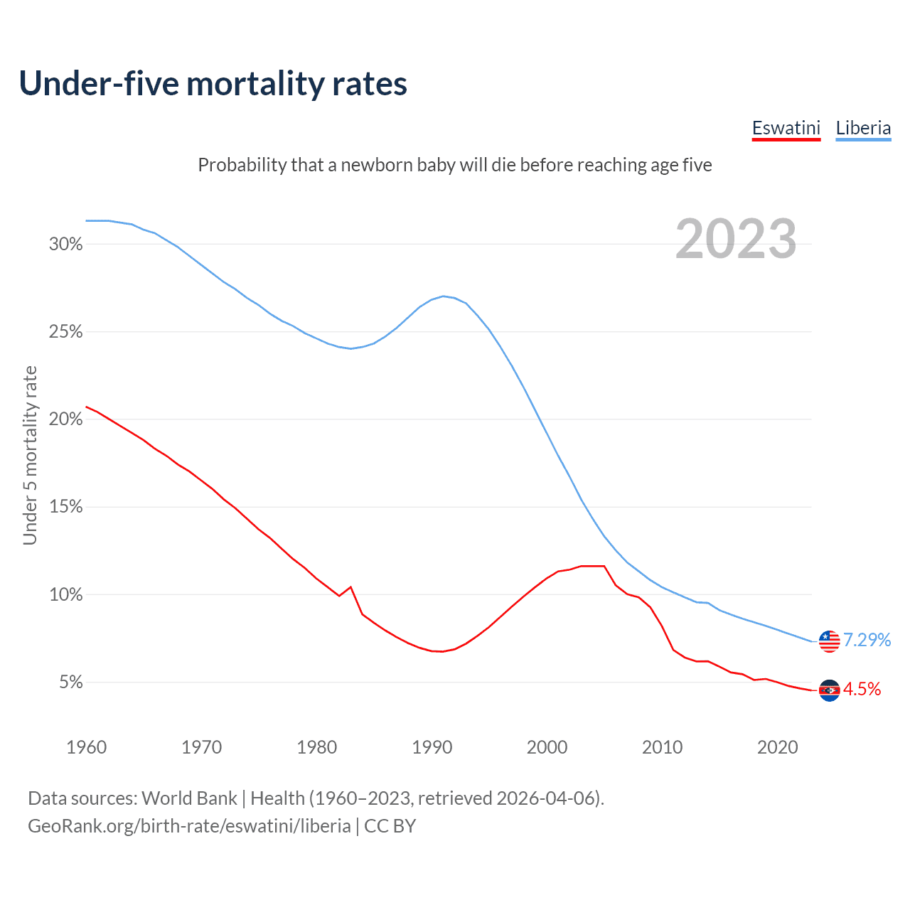 The chance that a newborn baby will die before reaching age five is 4.5% in Eswatini and 7.29% in Liberia. Above is a chart with historical data on under-five mortality rates.