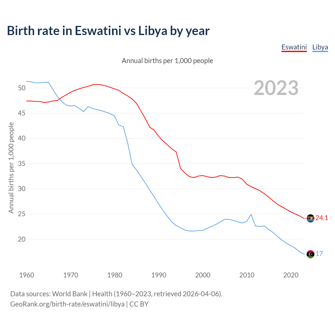 Eswatini has an annual birth rate of 24.1 births per 1,000 people, compared to 17 for Libya. The average number of children a woman is expected to have during her lifetime — the fertility rate, is 2.75 in Eswatini and 2.36 in Libya — 14.5% difference.