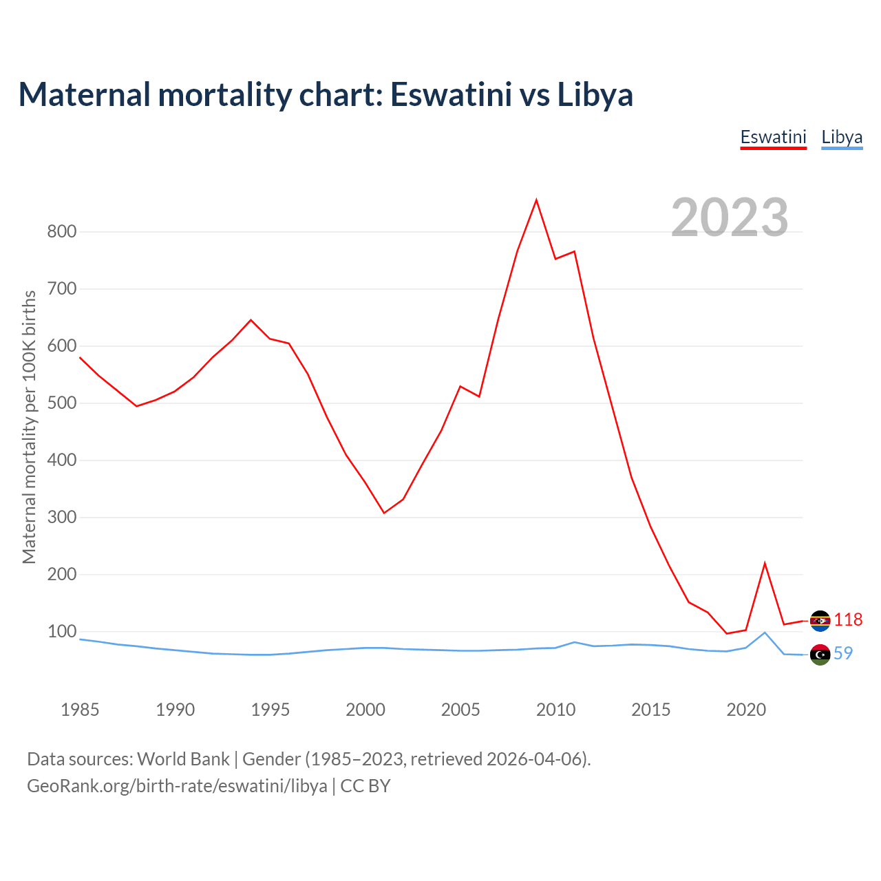 The maternal mortality rate, which is the probability of dying during childbirth or within 42 days of pregnancy termination, is 118 deaths per 100,000 live births in Eswatini, compared to 59 deaths in Libya.