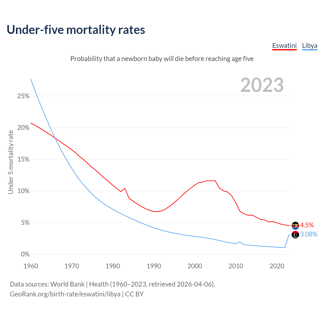 The chance that a newborn baby will die before reaching age five is 4.5% in Eswatini and 3.08% in Libya. Above is a chart with historical data on under-five mortality rates.