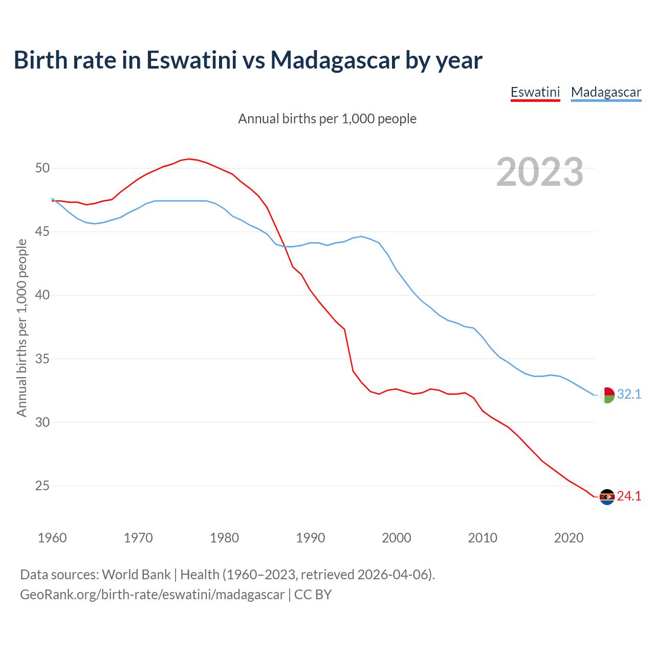 Eswatini has an annual birth rate of 24.1 births per 1,000 people, compared to 32.1 for Madagascar. The average number of children a woman is expected to have during her lifetime — the fertility rate, is 2.75 in Eswatini and 3.97 in Madagascar — 44.3% difference.