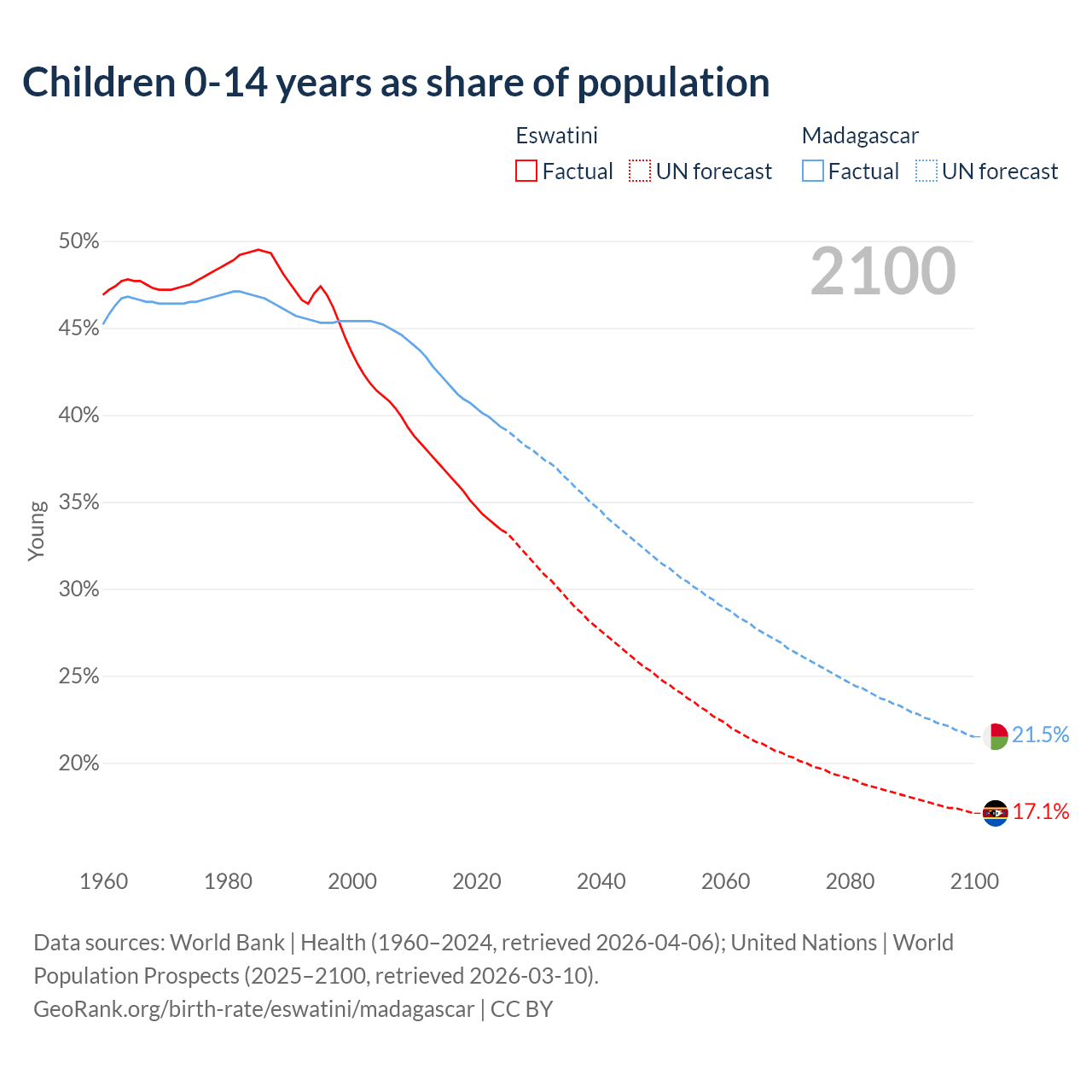 According to the latest available data on birth rates, the fertility rate in Eswatini was 2.75 children per woman in 2023, compared to 3.97 in Madagascar in 2023. The replacement level is considered to be 2.1 children per woman.