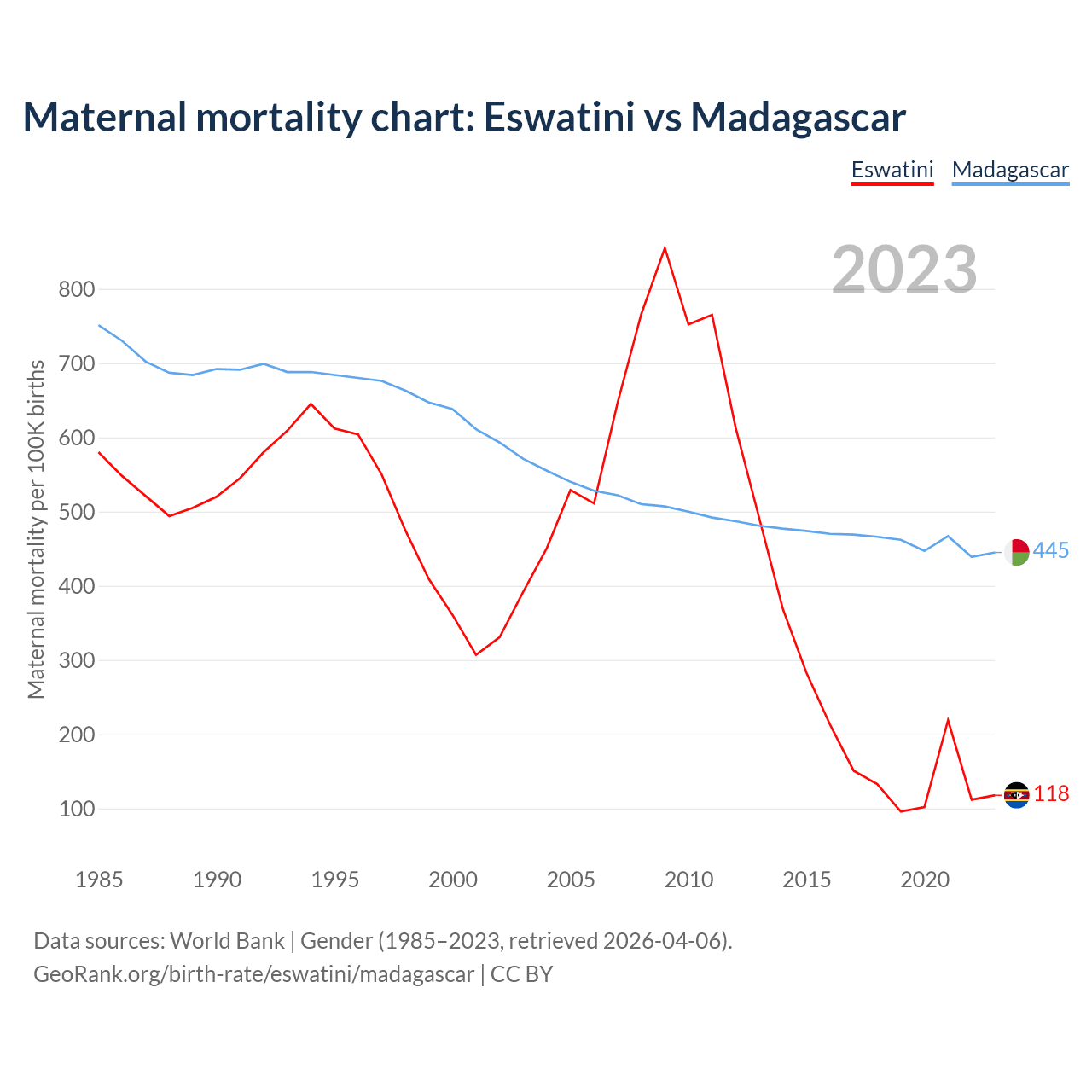 The maternal mortality rate, which is the probability of dying during childbirth or within 42 days of pregnancy termination, is 118 deaths per 100,000 live births in Eswatini, compared to 445 deaths in Madagascar.
