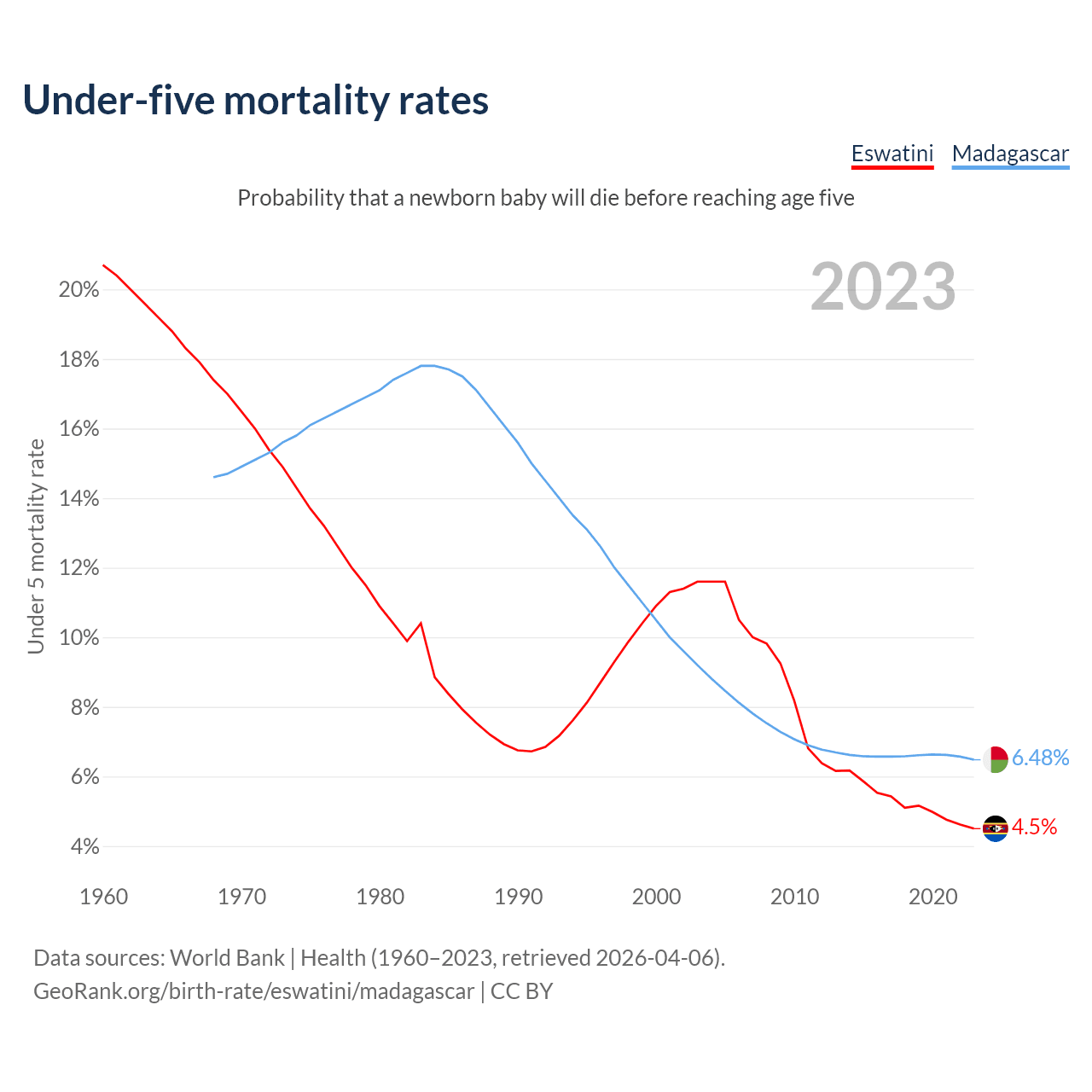 The chance that a newborn baby will die before reaching age five is 4.5% in Eswatini and 6.48% in Madagascar. Above is a chart with historical data on under-five mortality rates.