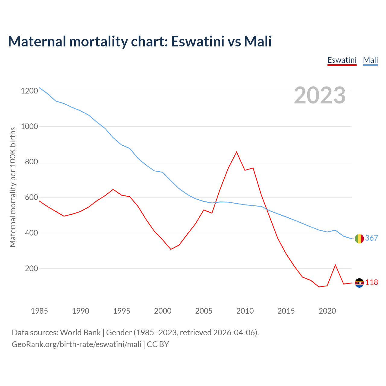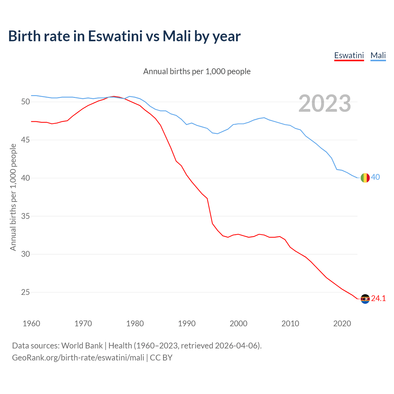 Eswatini has an annual birth rate of 24.1 births per 1,000 people, compared to 40 for Mali. The average number of children a woman is expected to have during her lifetime — the fertility rate, is 2.75 in Eswatini and 5.61 in Mali — 103.9% difference.