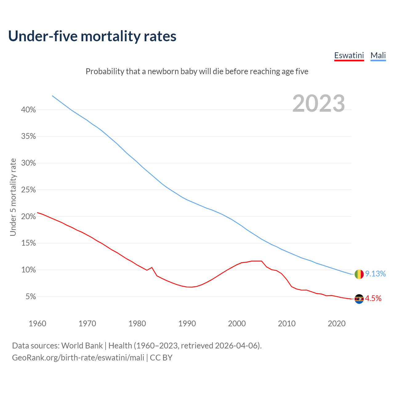 The chance that a newborn baby will die before reaching age five is 4.5% in Eswatini and 9.13% in Mali. Above is a chart with historical data on under-five mortality rates.
