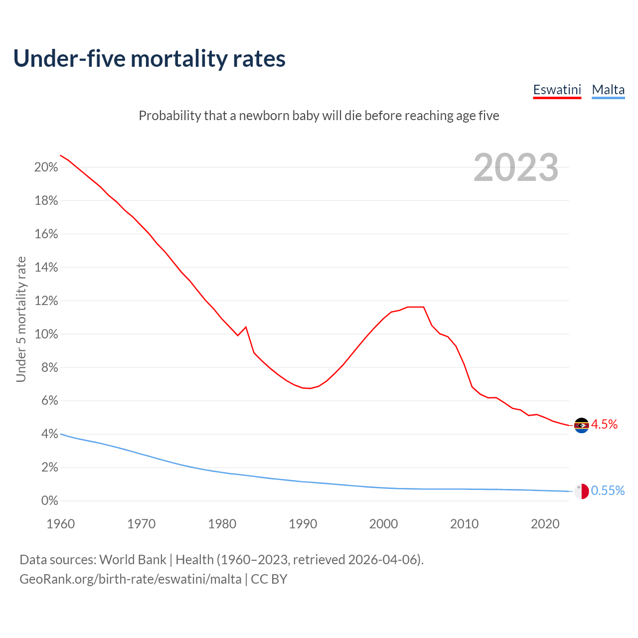The chance that a newborn baby will die before reaching age five is 4.5% in Eswatini and 0.55% in Malta. Above is a chart with historical data on under-five mortality rates.