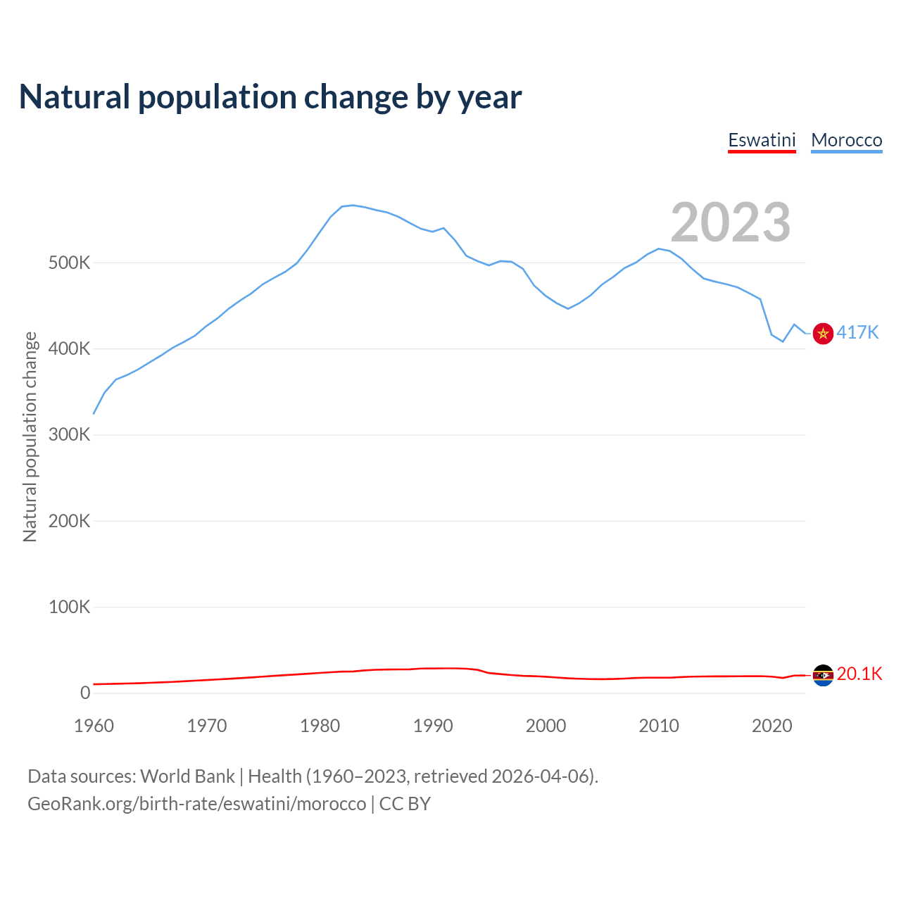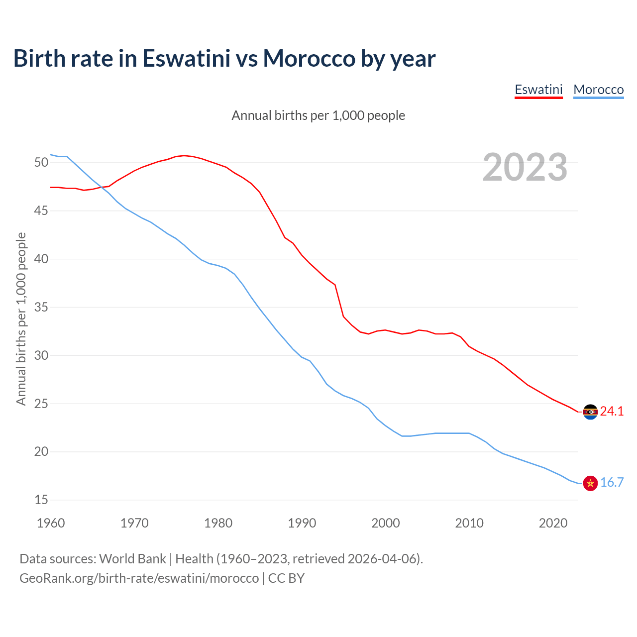 Eswatini has an annual birth rate of 24.1 births per 1,000 people, compared to 16.7 for Morocco. The average number of children a woman is expected to have during her lifetime — the fertility rate, is 2.75 in Eswatini and 2.23 in Morocco — 19% difference.