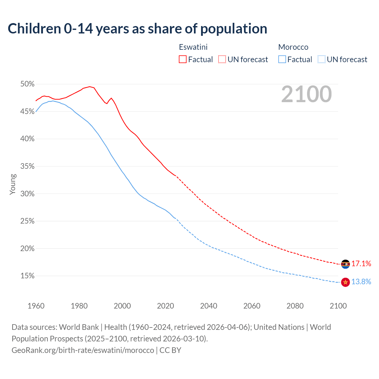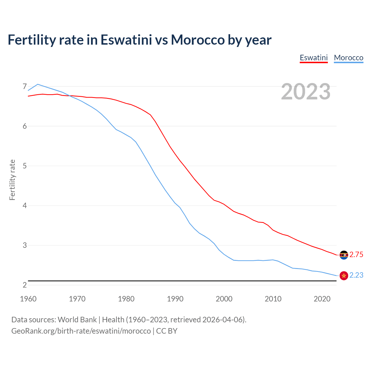 According to the latest available data on birth rates, the fertility rate in Eswatini was 2.75 children per woman in 2023, compared to 2.23 in Morocco in 2023. The replacement level is considered to be 2.1 children per woman.