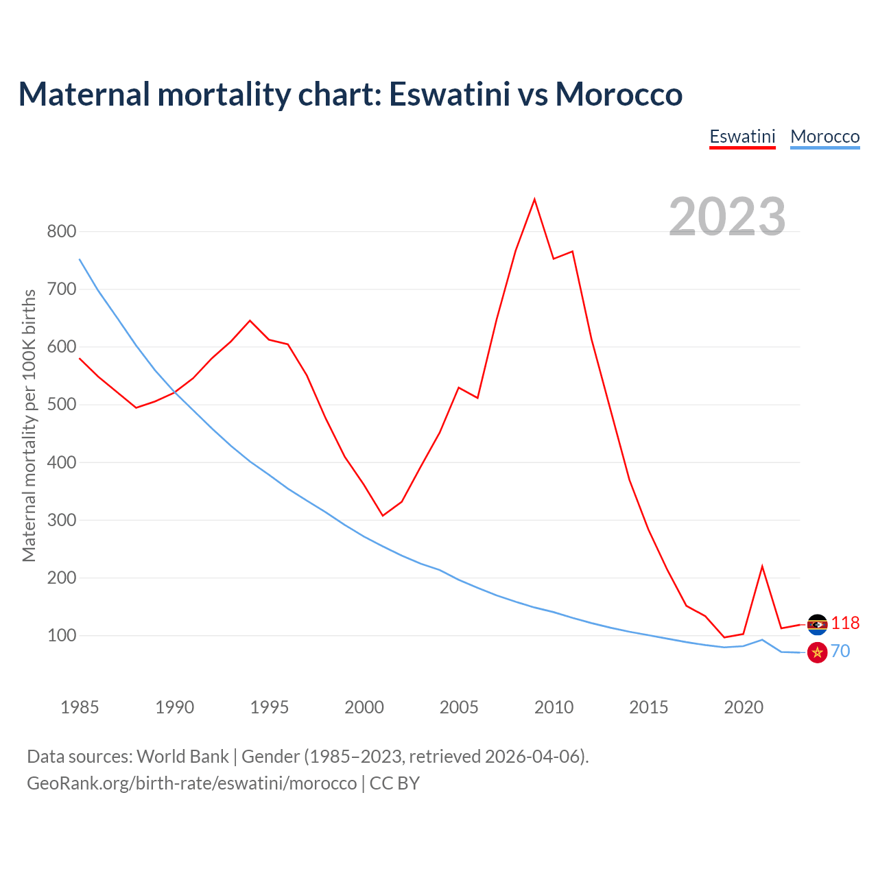 The maternal mortality rate, which is the probability of dying during childbirth or within 42 days of pregnancy termination, is 118 deaths per 100,000 live births in Eswatini, compared to 70 deaths in Morocco.