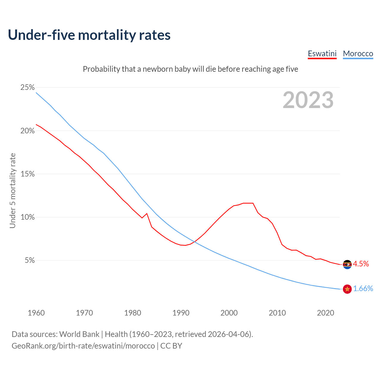 The chance that a newborn baby will die before reaching age five is 4.5% in Eswatini and 1.66% in Morocco. Above is a chart with historical data on under-five mortality rates.