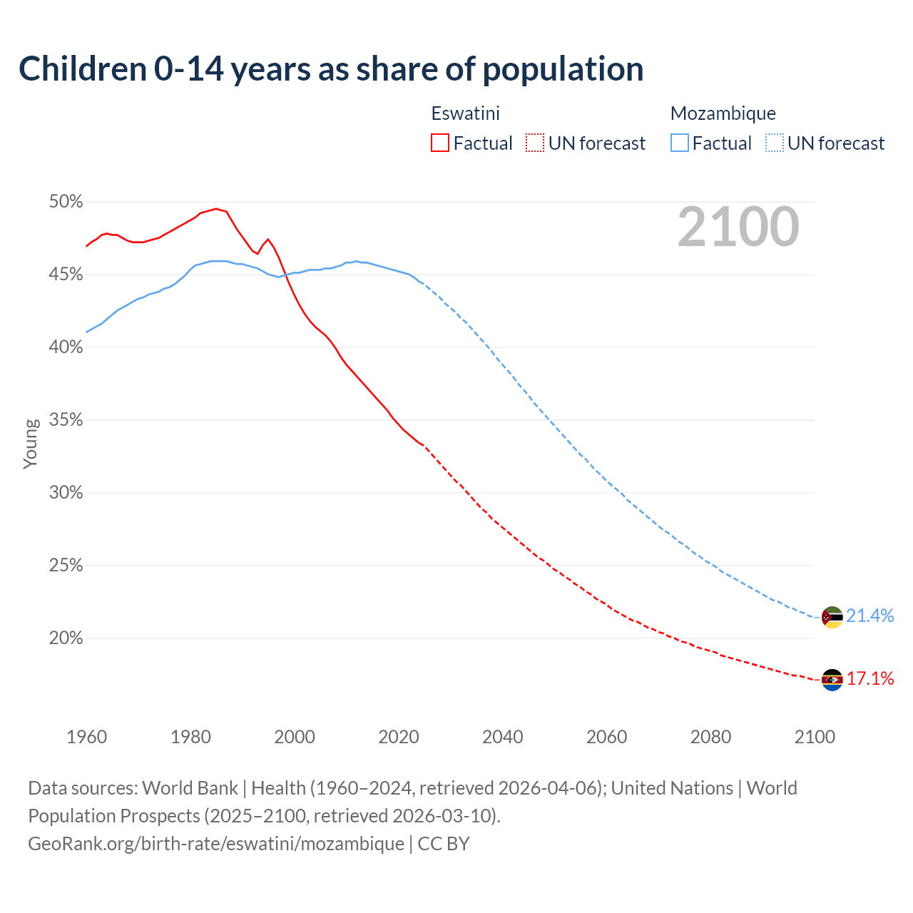 According to the latest available data on birth rates, the fertility rate in Eswatini was 2.75 children per woman in 2023, compared to 4.76 in Mozambique in 2023. The replacement level is considered to be 2.1 children per woman.