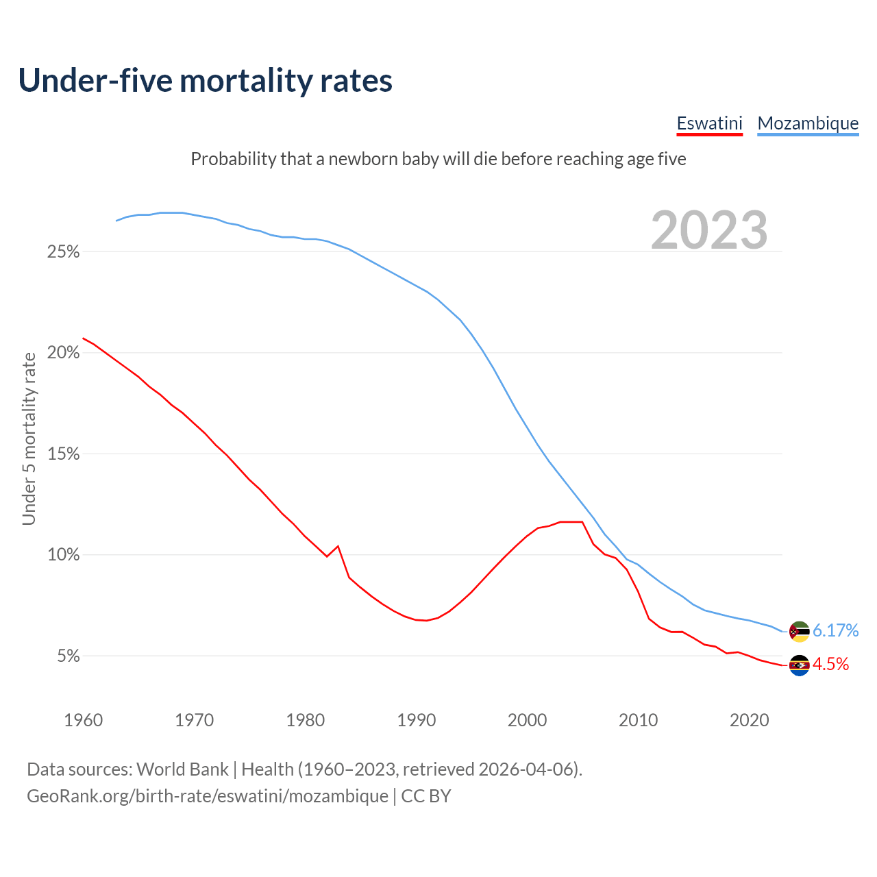 The chance that a newborn baby will die before reaching age five is 4.5% in Eswatini and 6.17% in Mozambique. Above is a chart with historical data on under-five mortality rates.