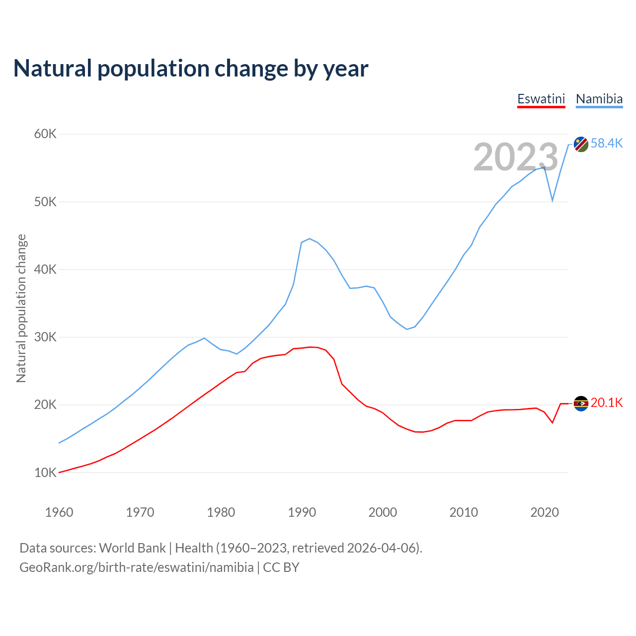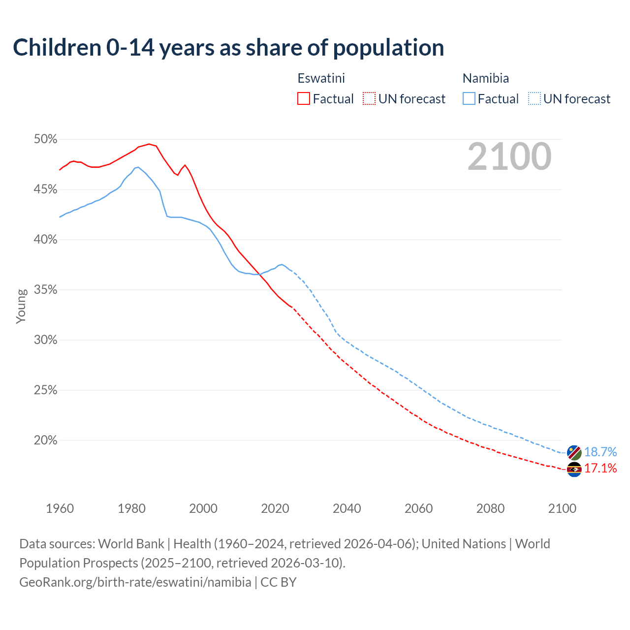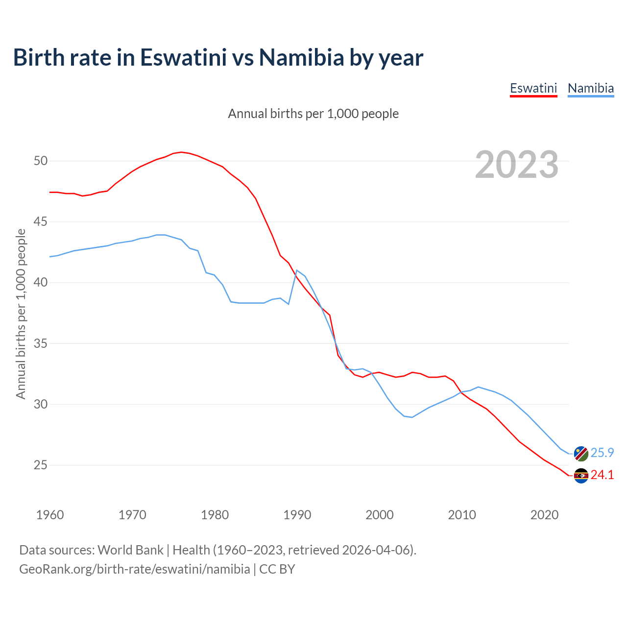 According to the latest available data on birth rates, the fertility rate in Eswatini was 2.75 children per woman in 2023, compared to 3.21 in Namibia in 2023. The replacement level is considered to be 2.1 children per woman.