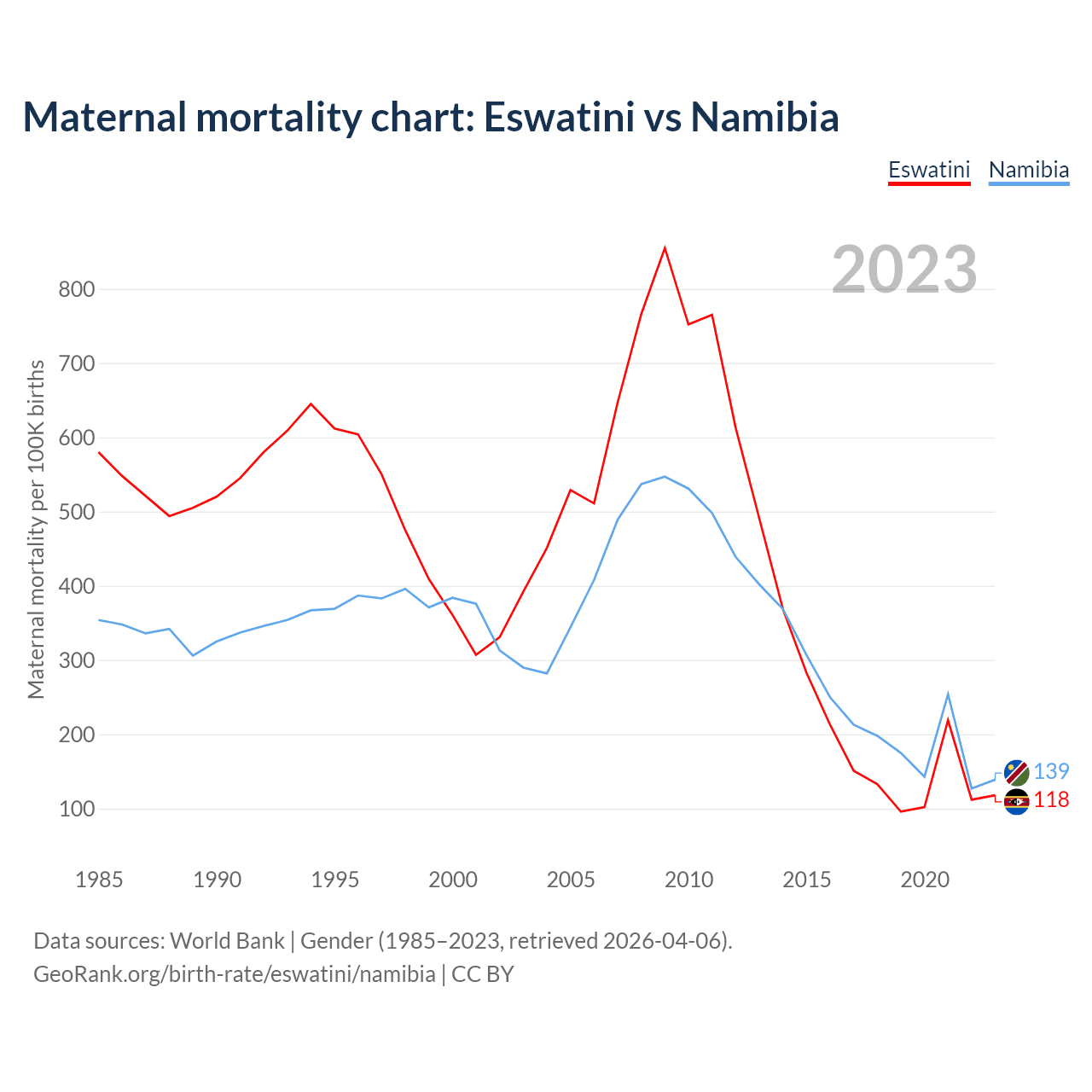 The maternal mortality rate, which is the probability of dying during childbirth or within 42 days of pregnancy termination, is 118 deaths per 100,000 live births in Eswatini, compared to 139 deaths in Namibia.
