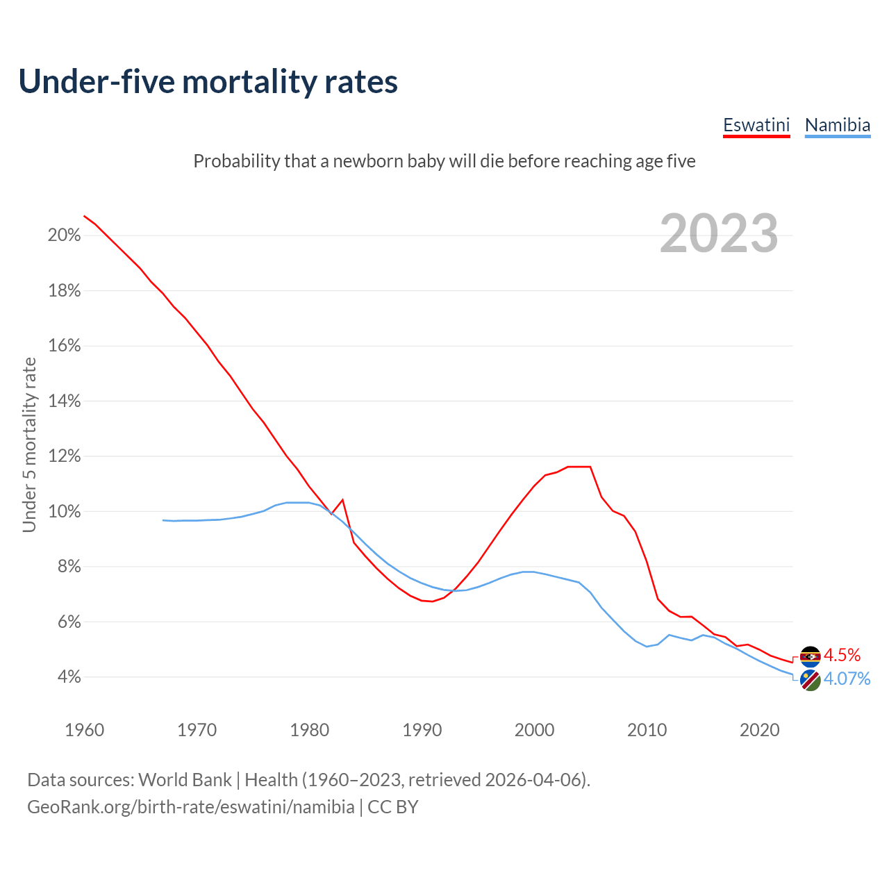 The chance that a newborn baby will die before reaching age five is 4.5% in Eswatini and 4.07% in Namibia. Above is a chart with historical data on under-five mortality rates.