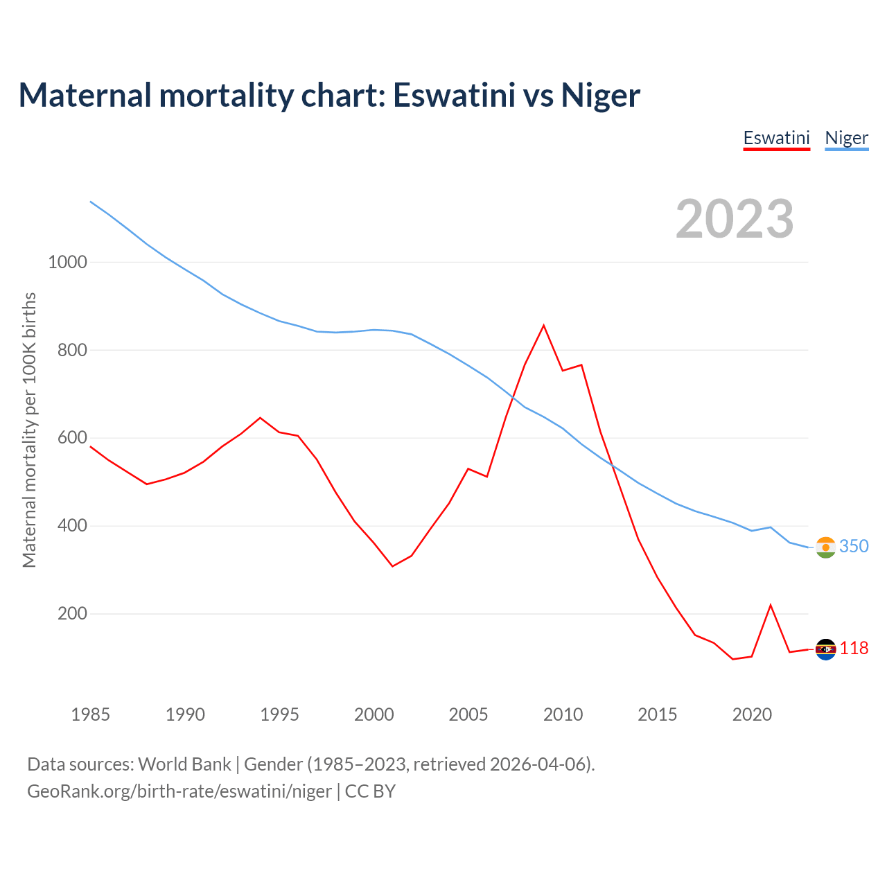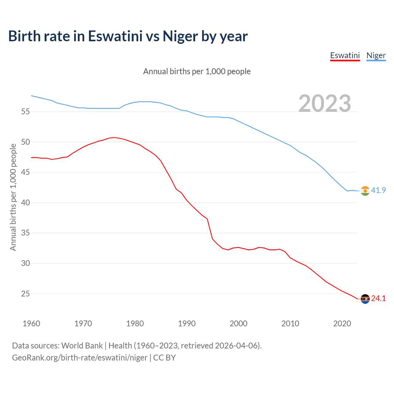 Eswatini has an annual birth rate of 24.1 births per 1,000 people, compared to 41.9 for Niger. The average number of children a woman is expected to have during her lifetime — the fertility rate, is 2.75 in Eswatini and 6.06 in Niger — 120.2% difference.