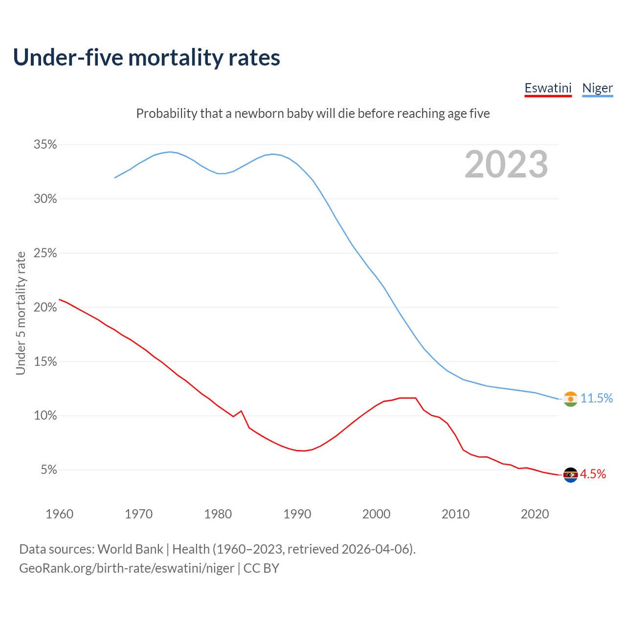 The chance that a newborn baby will die before reaching age five is 4.5% in Eswatini and 11.5% in Niger. Above is a chart with historical data on under-five mortality rates.