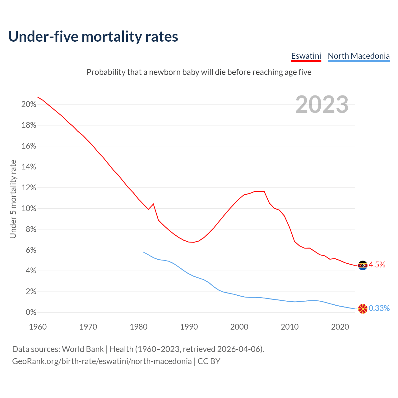 The chance that a newborn baby will die before reaching age five is 4.5% in Eswatini and 0.33% in North Macedonia. Above is a chart with historical data on under-five mortality rates.
