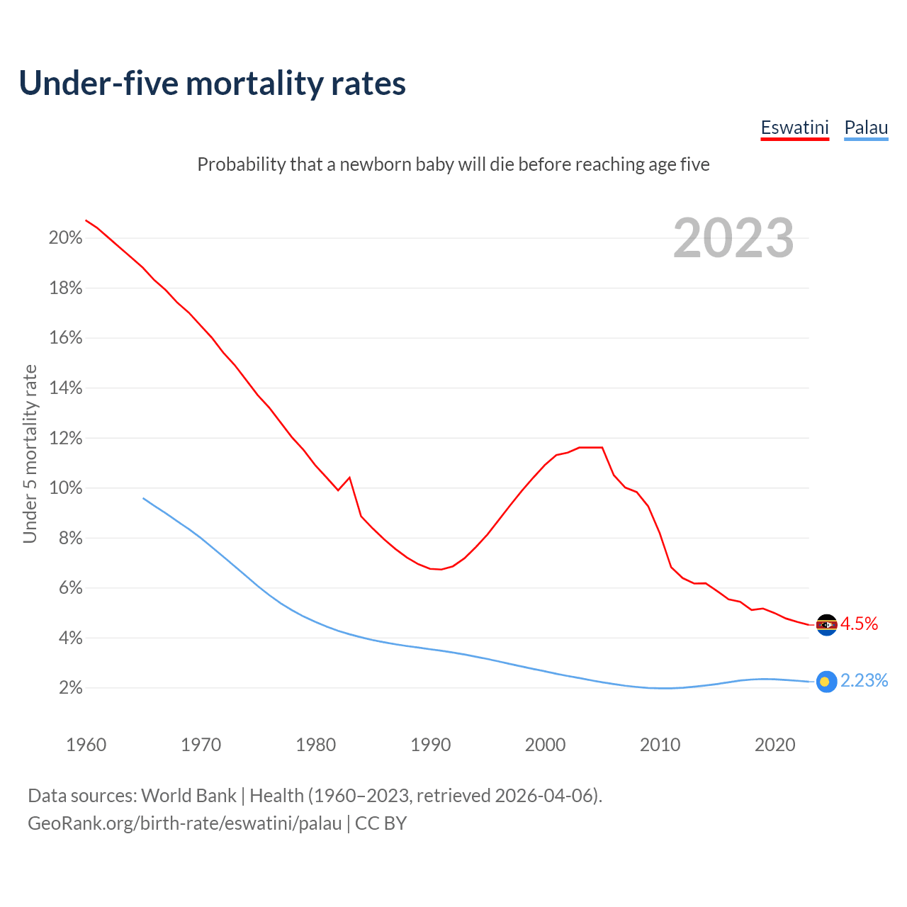 The chance that a newborn baby will die before reaching age five is 4.5% in Eswatini and 2.23% in Palau. Above is a chart with historical data on under-five mortality rates.
