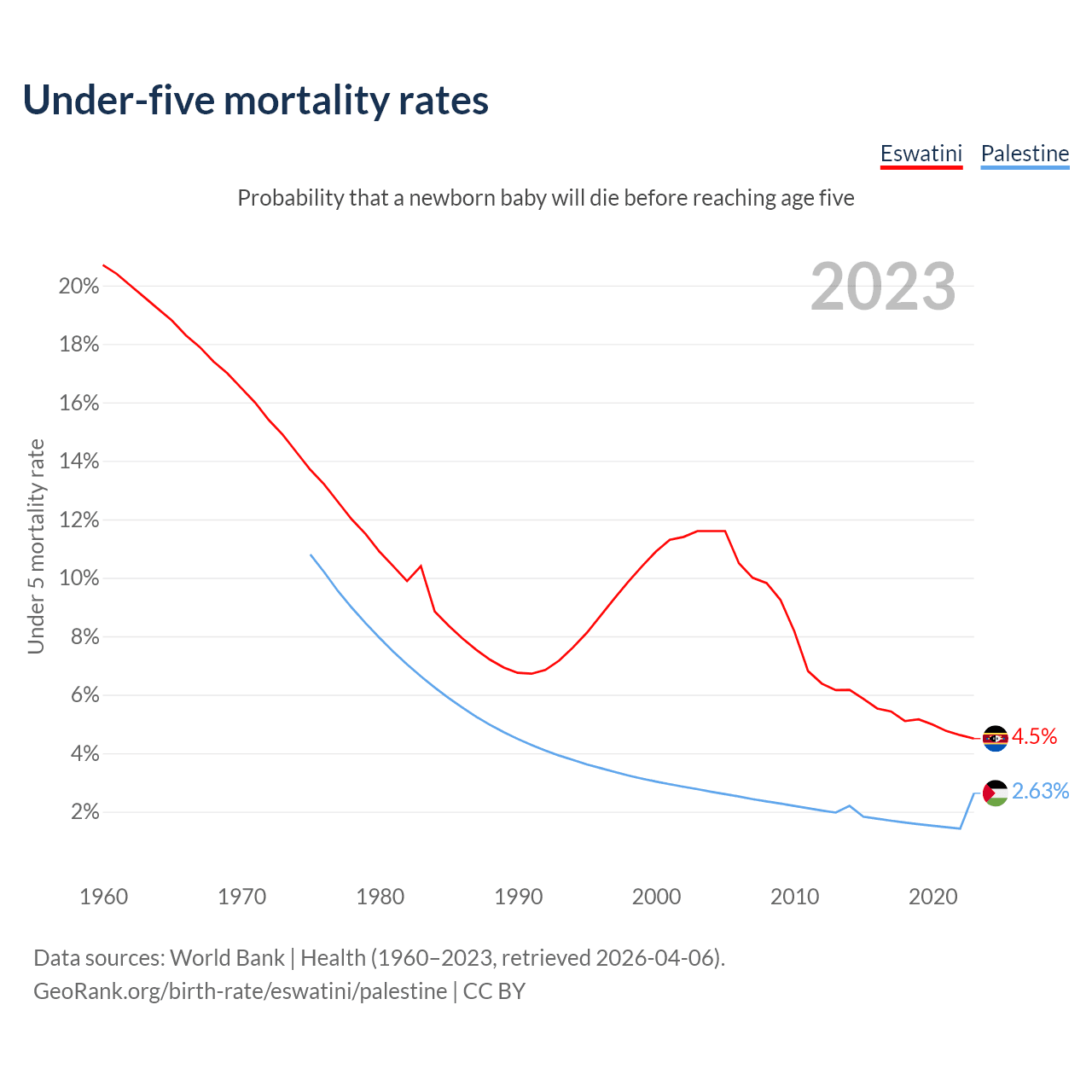 The chance that a newborn baby will die before reaching age five is 4.5% in Eswatini and 2.63% in Palestine. Above is a chart with historical data on under-five mortality rates.