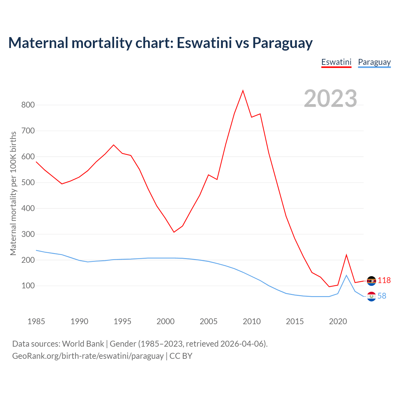 The maternal mortality rate, which is the probability of dying during childbirth or within 42 days of pregnancy termination, is 118 deaths per 100,000 live births in Eswatini, compared to 58 deaths in Paraguay.