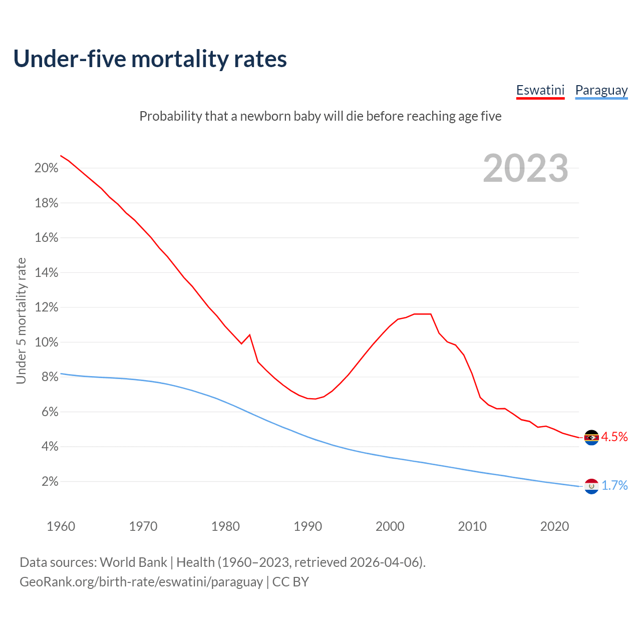 The chance that a newborn baby will die before reaching age five is 4.5% in Eswatini and 1.7% in Paraguay. Above is a chart with historical data on under-five mortality rates.