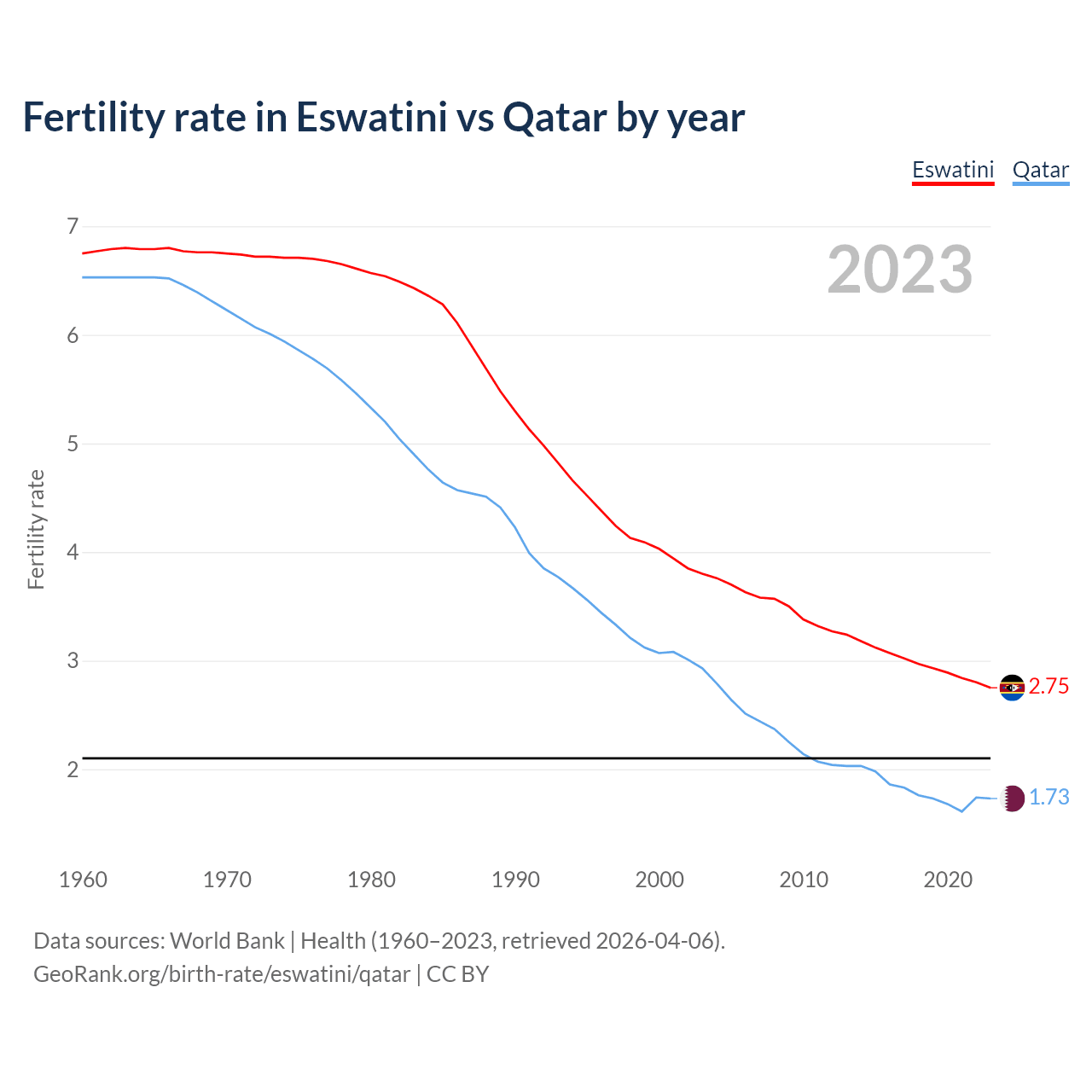 According to the latest available data on birth rates, the fertility rate in Eswatini was 2.75 children per woman in 2023, compared to 1.73 in Qatar in 2023. The replacement level is considered to be 2.1 children per woman.
