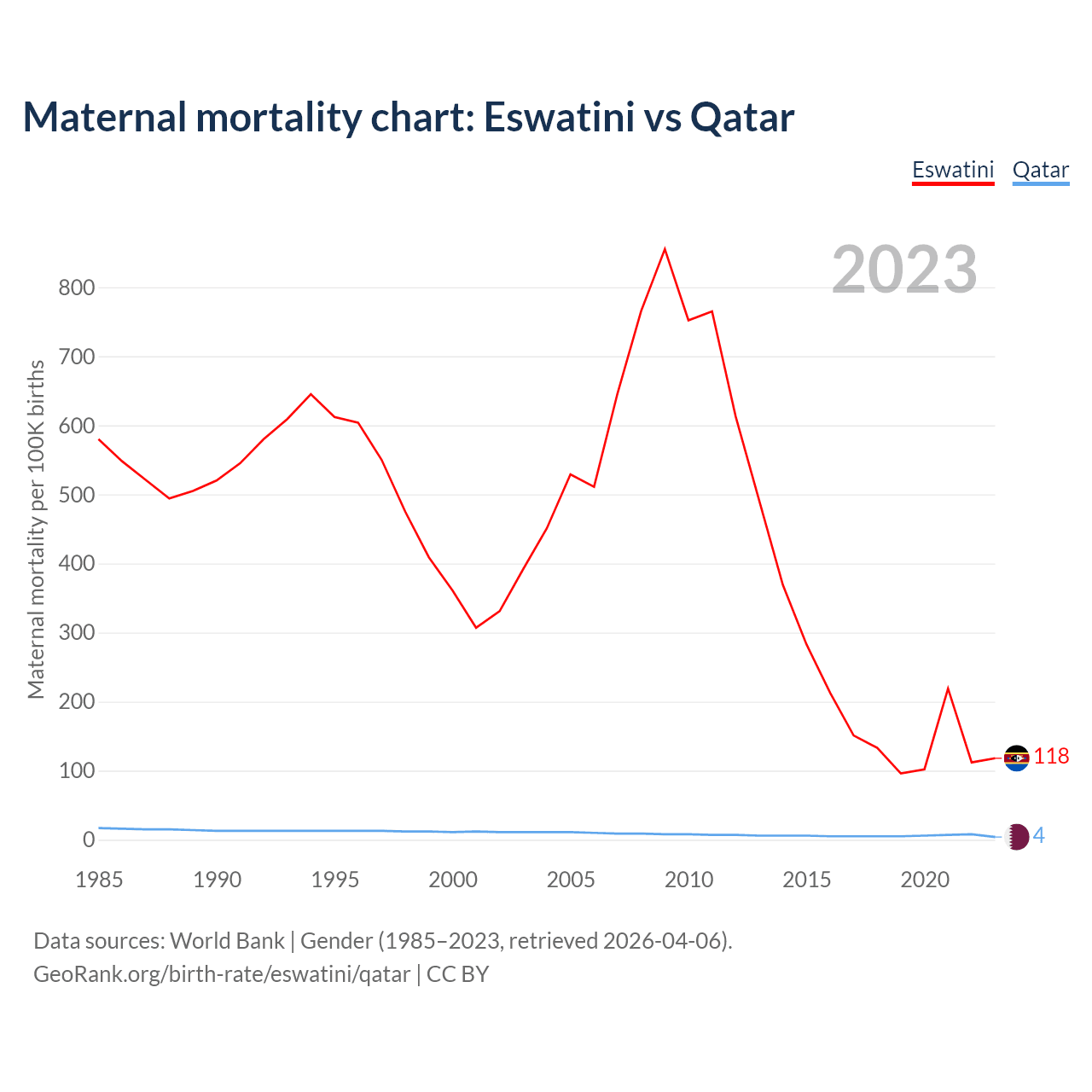 The maternal mortality rate, which is the probability of dying during childbirth or within 42 days of pregnancy termination, is 118 deaths per 100,000 live births in Eswatini, compared to 4 deaths in Qatar.