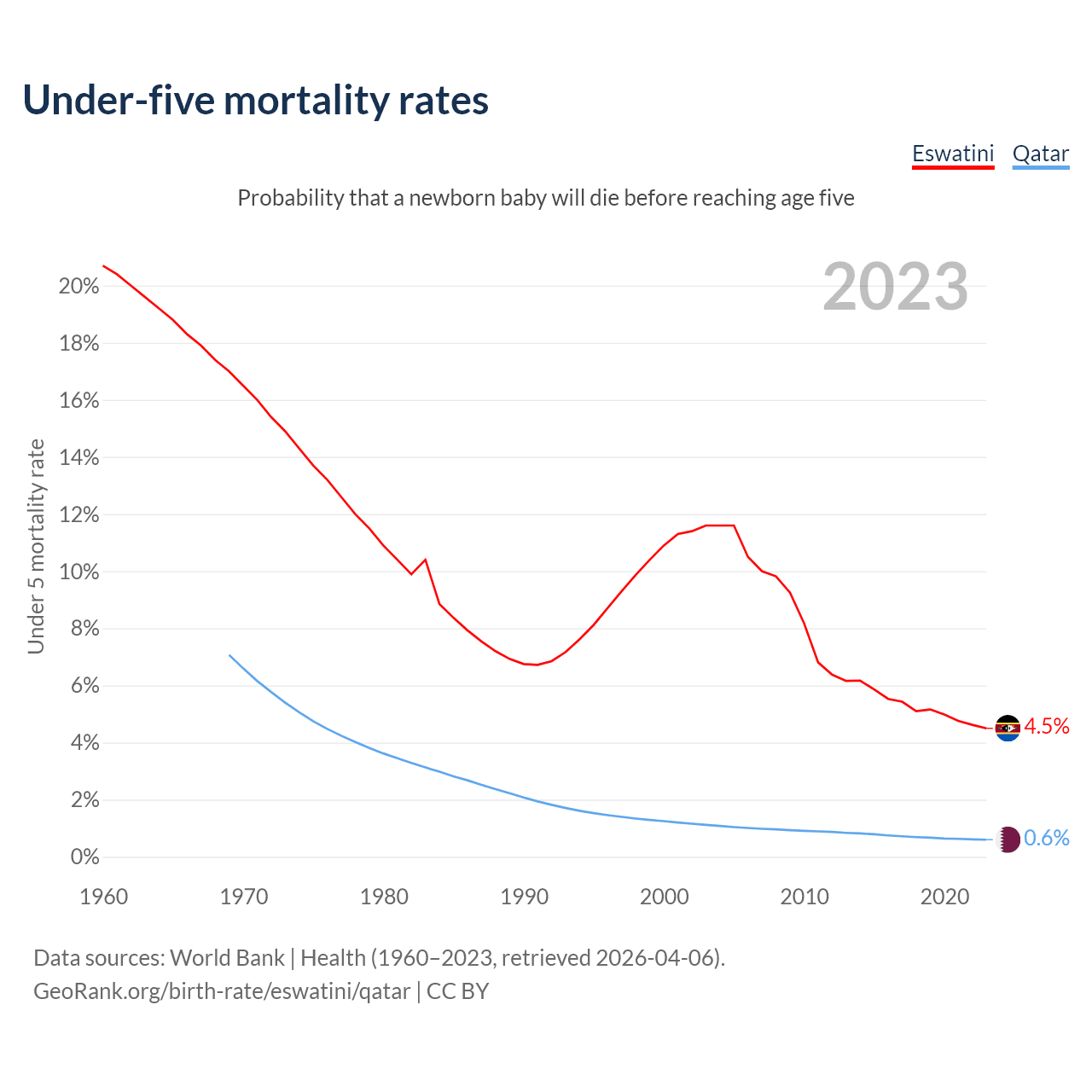 The chance that a newborn baby will die before reaching age five is 4.5% in Eswatini and 0.6% in Qatar. Above is a chart with historical data on under-five mortality rates.