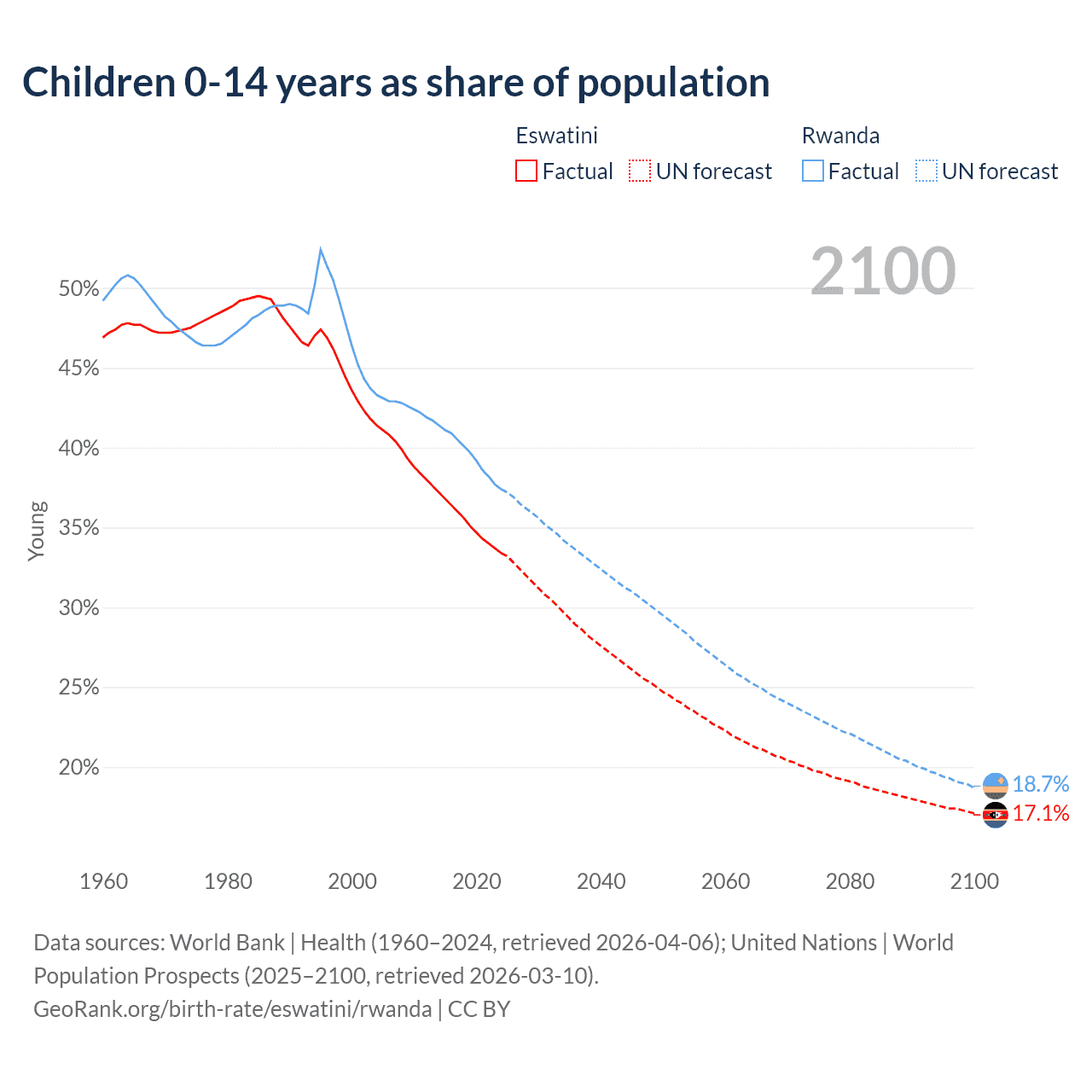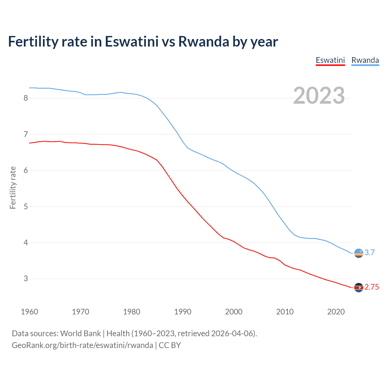 According to the latest available data on birth rates, the fertility rate in Eswatini was 2.75 children per woman in 2023, compared to 3.7 in Rwanda in 2023. The replacement level is considered to be 2.1 children per woman.