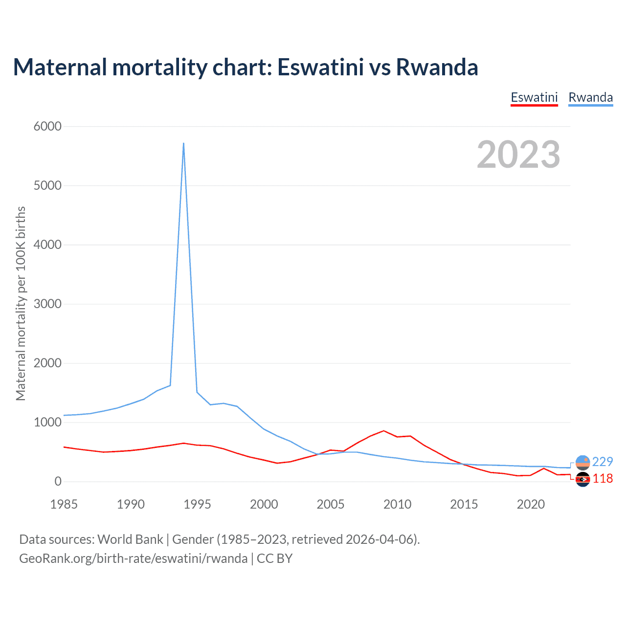 The maternal mortality rate, which is the probability of dying during childbirth or within 42 days of pregnancy termination, is 118 deaths per 100,000 live births in Eswatini, compared to 229 deaths in Rwanda.