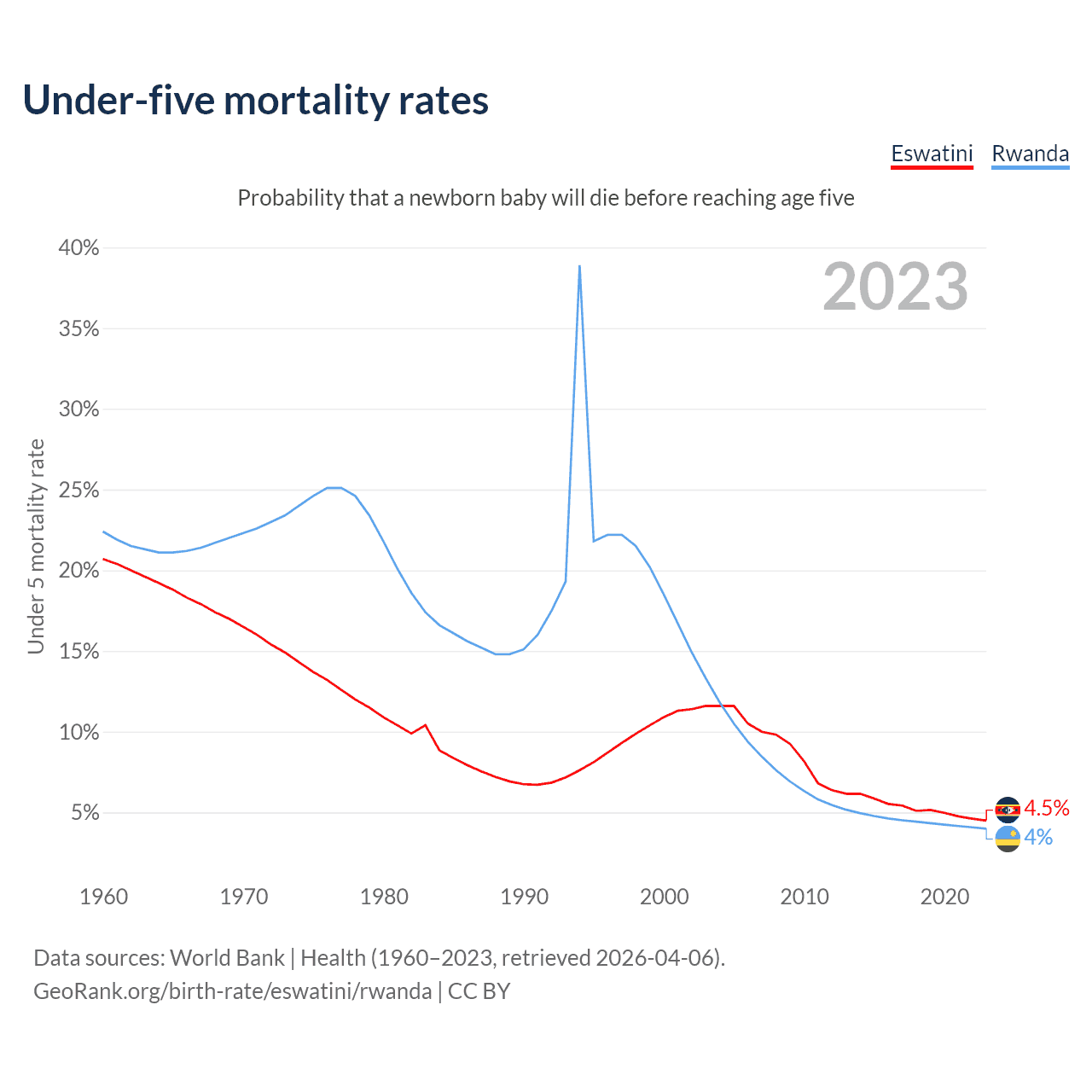 The chance that a newborn baby will die before reaching age five is 4.5% in Eswatini and 4% in Rwanda. Above is a chart with historical data on under-five mortality rates.