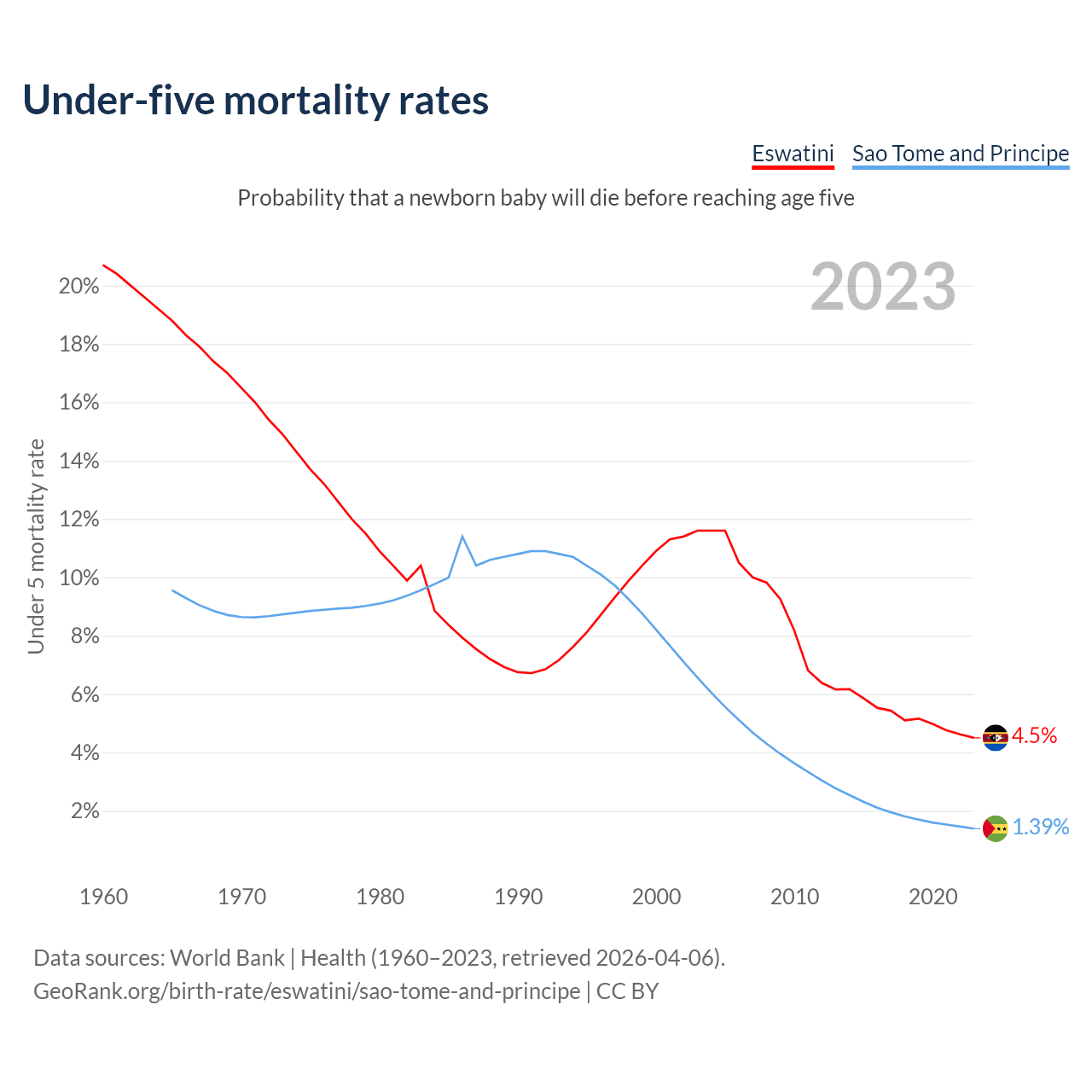 The chance that a newborn baby will die before reaching age five is 4.5% in Eswatini and 1.39% in Sao Tome and Principe. Above is a chart with historical data on under-five mortality rates.