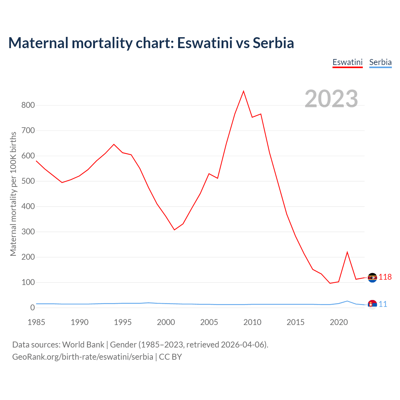 The maternal mortality rate, which is the probability of dying during childbirth or within 42 days of pregnancy termination, is 118 deaths per 100,000 live births in Eswatini, compared to 11 deaths in Serbia.