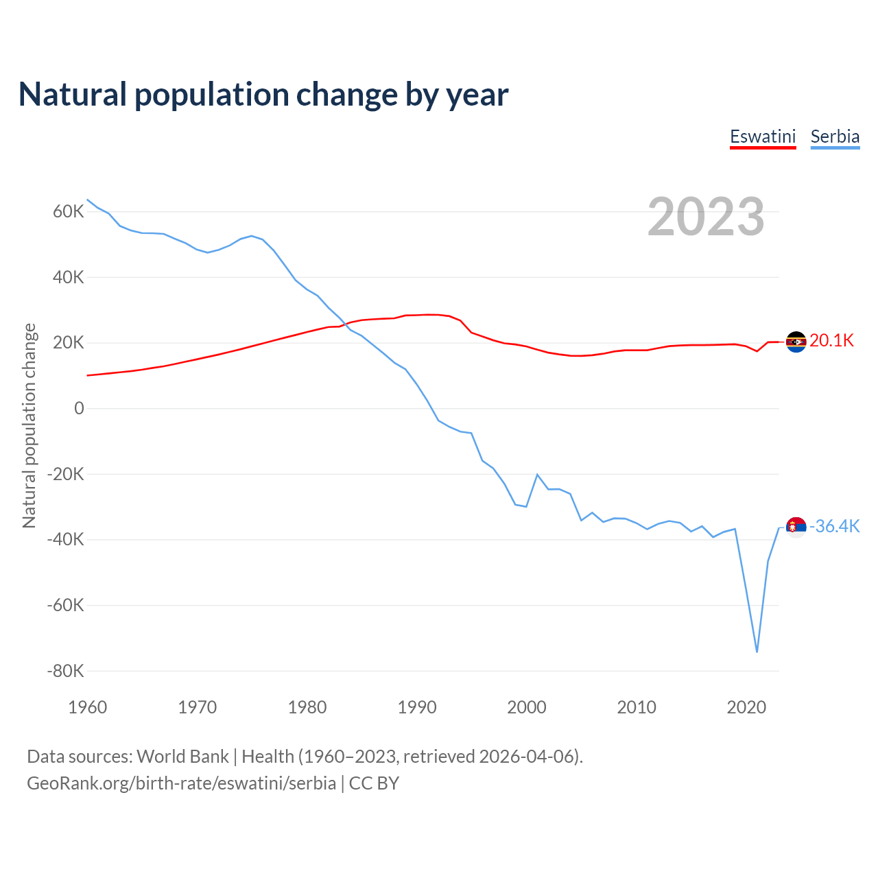 - Eswatini is ranked 57/196 by birth rate compared to 159/196 for Serbia.