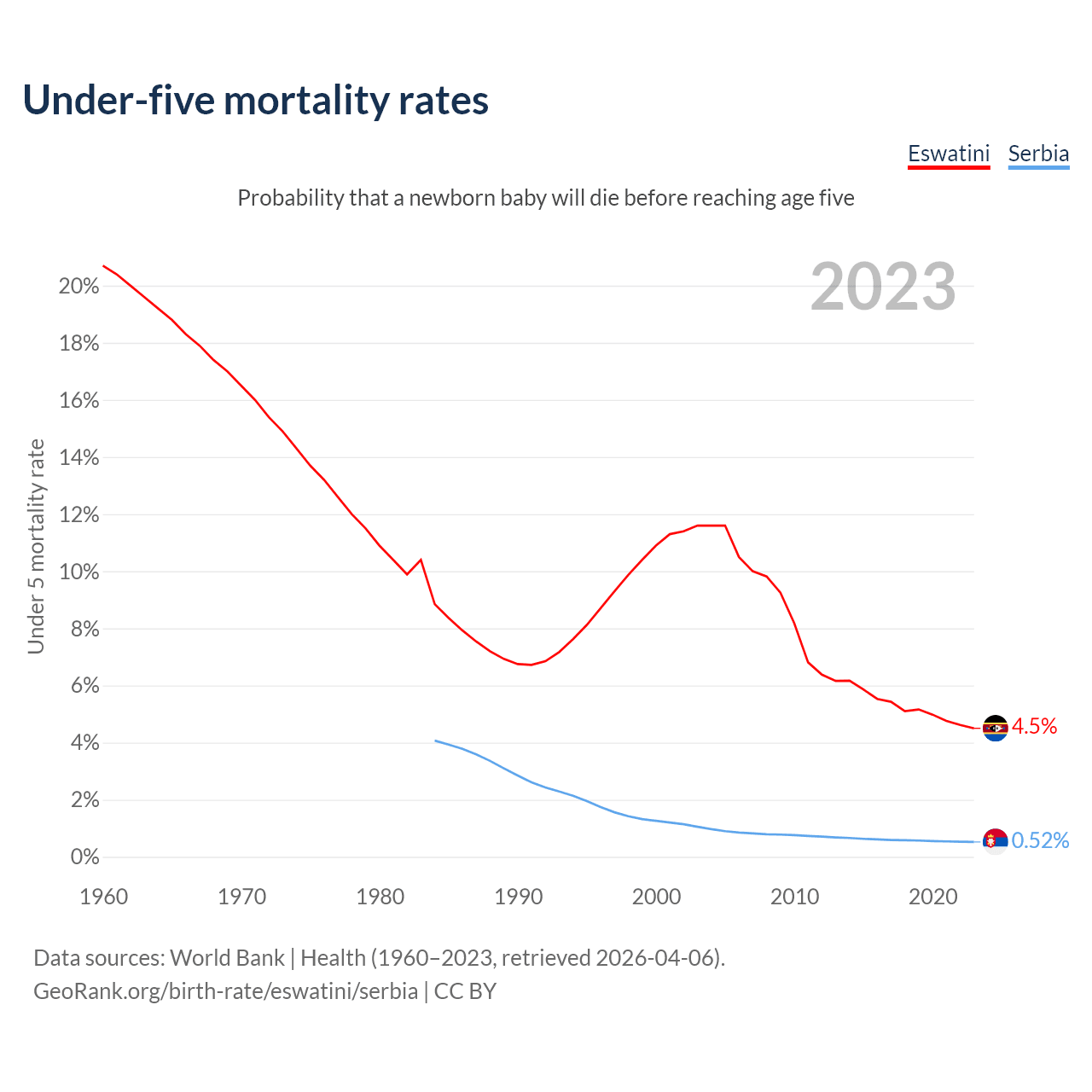The chance that a newborn baby will die before reaching age five is 4.5% in Eswatini and 0.52% in Serbia. Above is a chart with historical data on under-five mortality rates.
