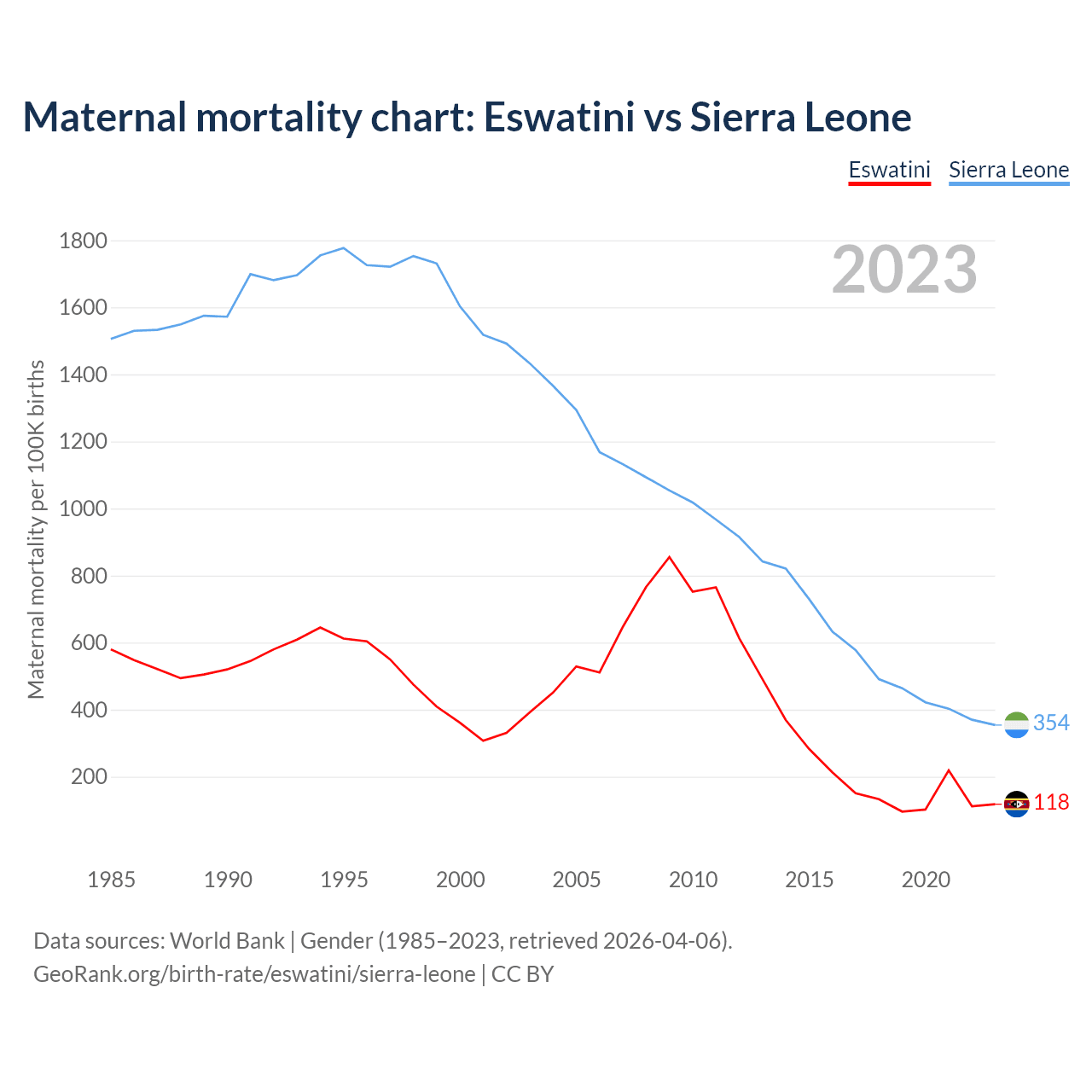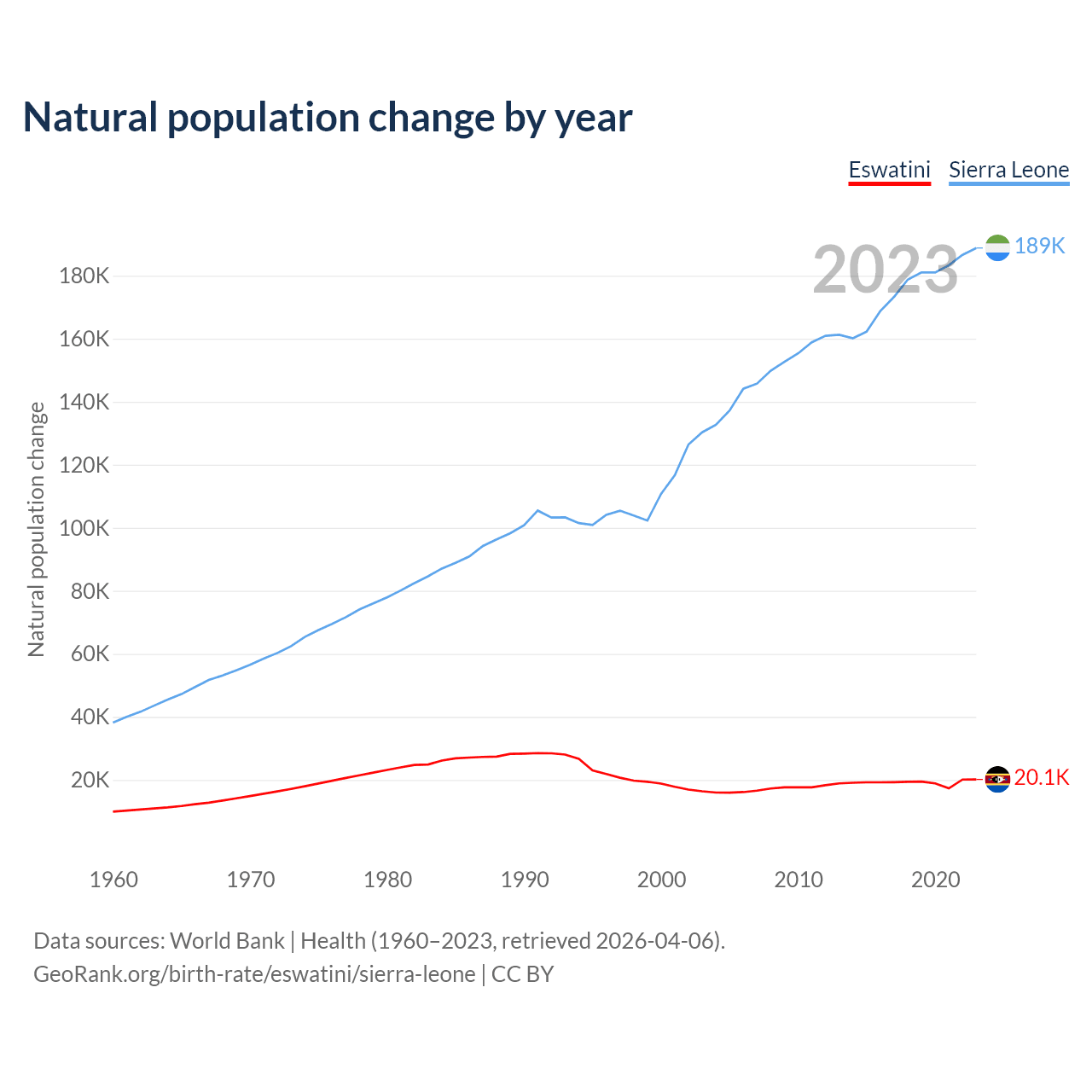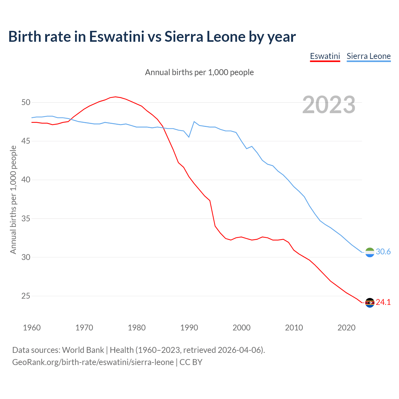 Eswatini has an annual birth rate of 24.1 births per 1,000 people, compared to 30.6 for Sierra Leone. The average number of children a woman is expected to have during her lifetime — the fertility rate, is 2.75 in Eswatini and 3.79 in Sierra Leone — 37.7% difference.