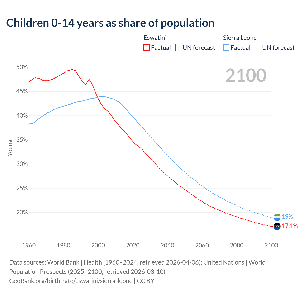 According to the latest available data on birth rates, the fertility rate in Eswatini was 2.75 children per woman in 2023, compared to 3.79 in Sierra Leone in 2023. The replacement level is considered to be 2.1 children per woman.