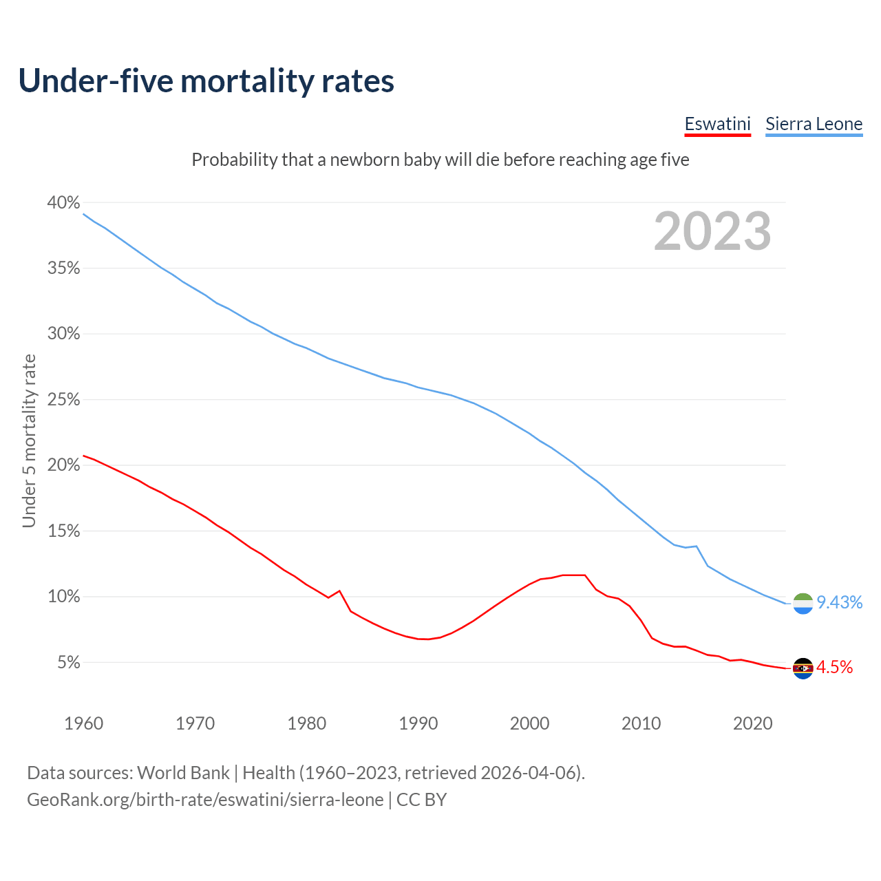 The chance that a newborn baby will die before reaching age five is 4.5% in Eswatini and 9.43% in Sierra Leone. Above is a chart with historical data on under-five mortality rates.