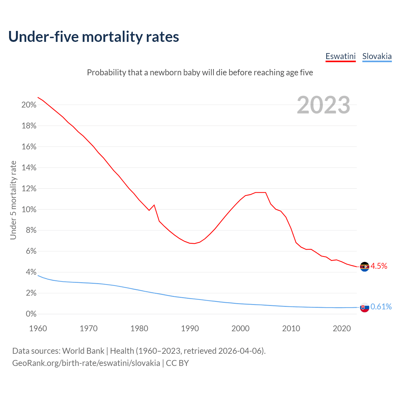 The chance that a newborn baby will die before reaching age five is 4.5% in Eswatini and 0.61% in Slovakia. Above is a chart with historical data on under-five mortality rates.