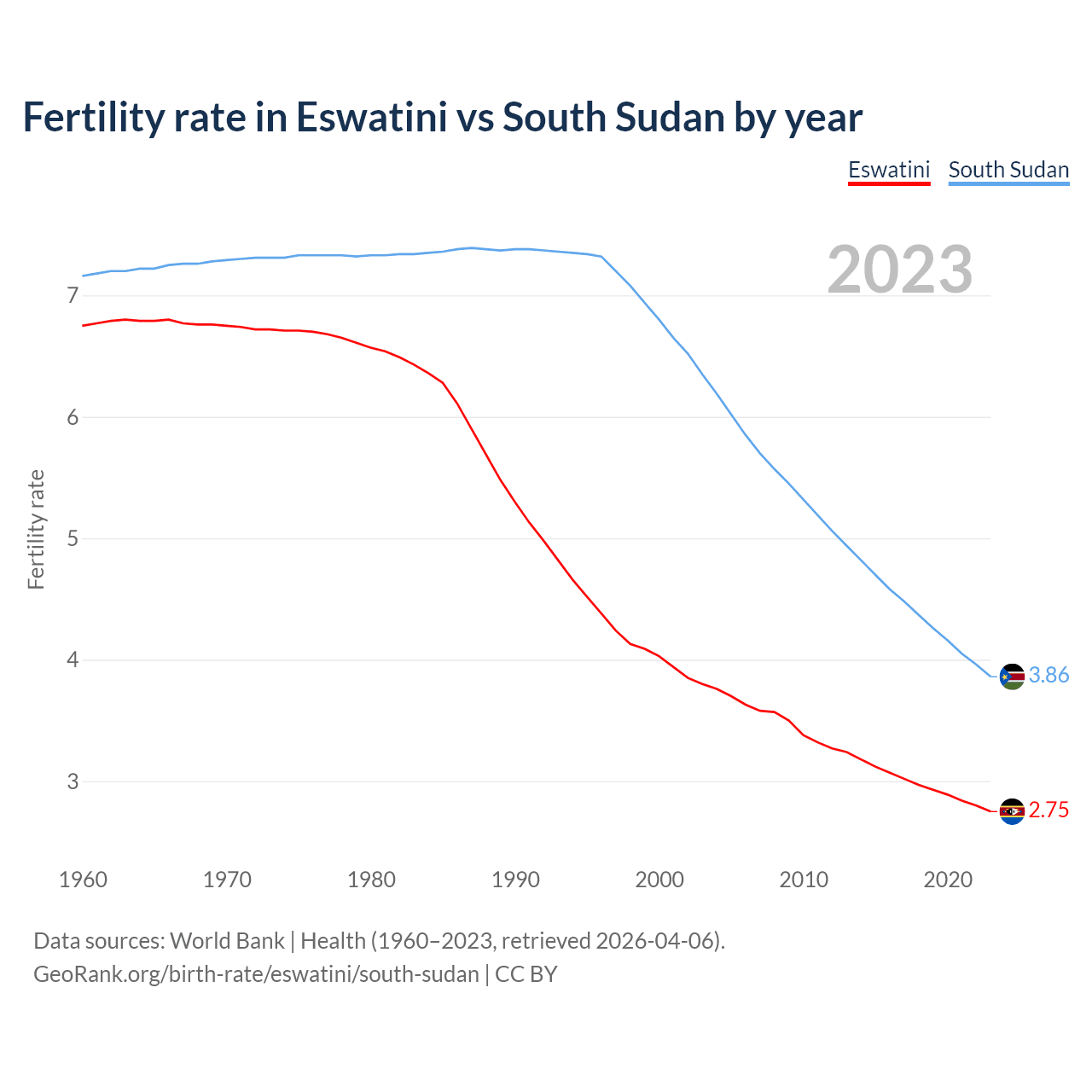 1960 vs 2023, the fertility rate has decreased by 59.2% in Eswatini and by 46% in South Sudan — in 1960, it was 6.75 and 7.16, respectively.