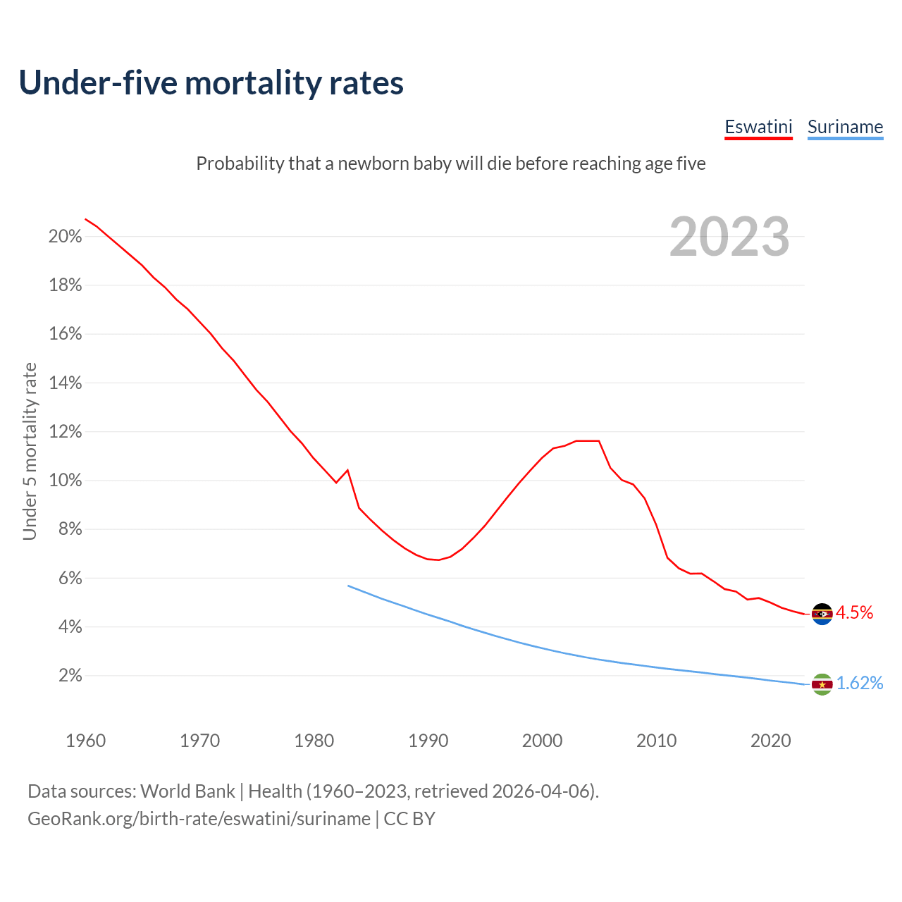 The chance that a newborn baby will die before reaching age five is 4.5% in Eswatini and 1.62% in Suriname. Above is a chart with historical data on under-five mortality rates.