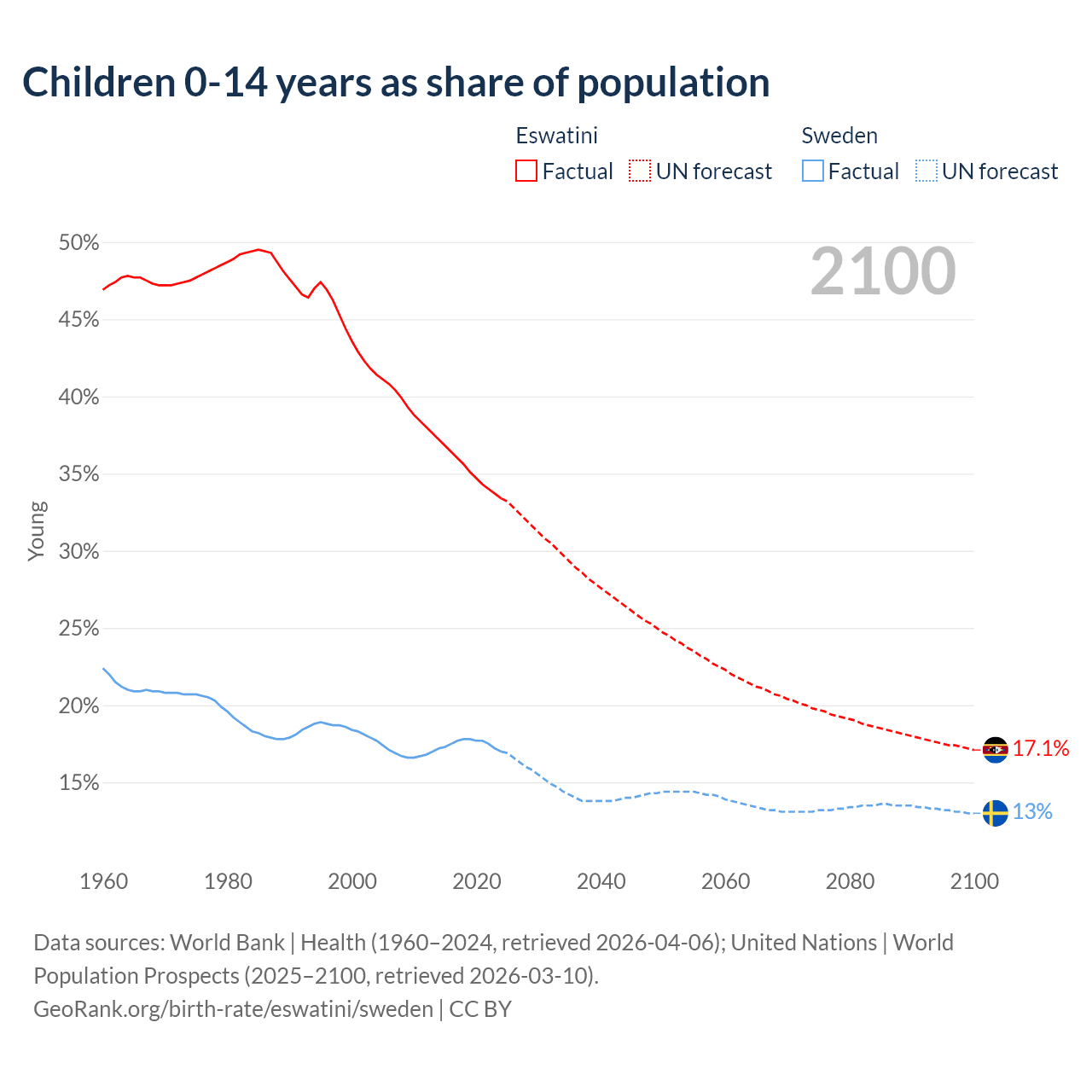 According to the latest available data on birth rates, the fertility rate in Eswatini was 2.75 children per woman in 2023, compared to 1.45 in Sweden in 2023. The replacement level is considered to be 2.1 children per woman.