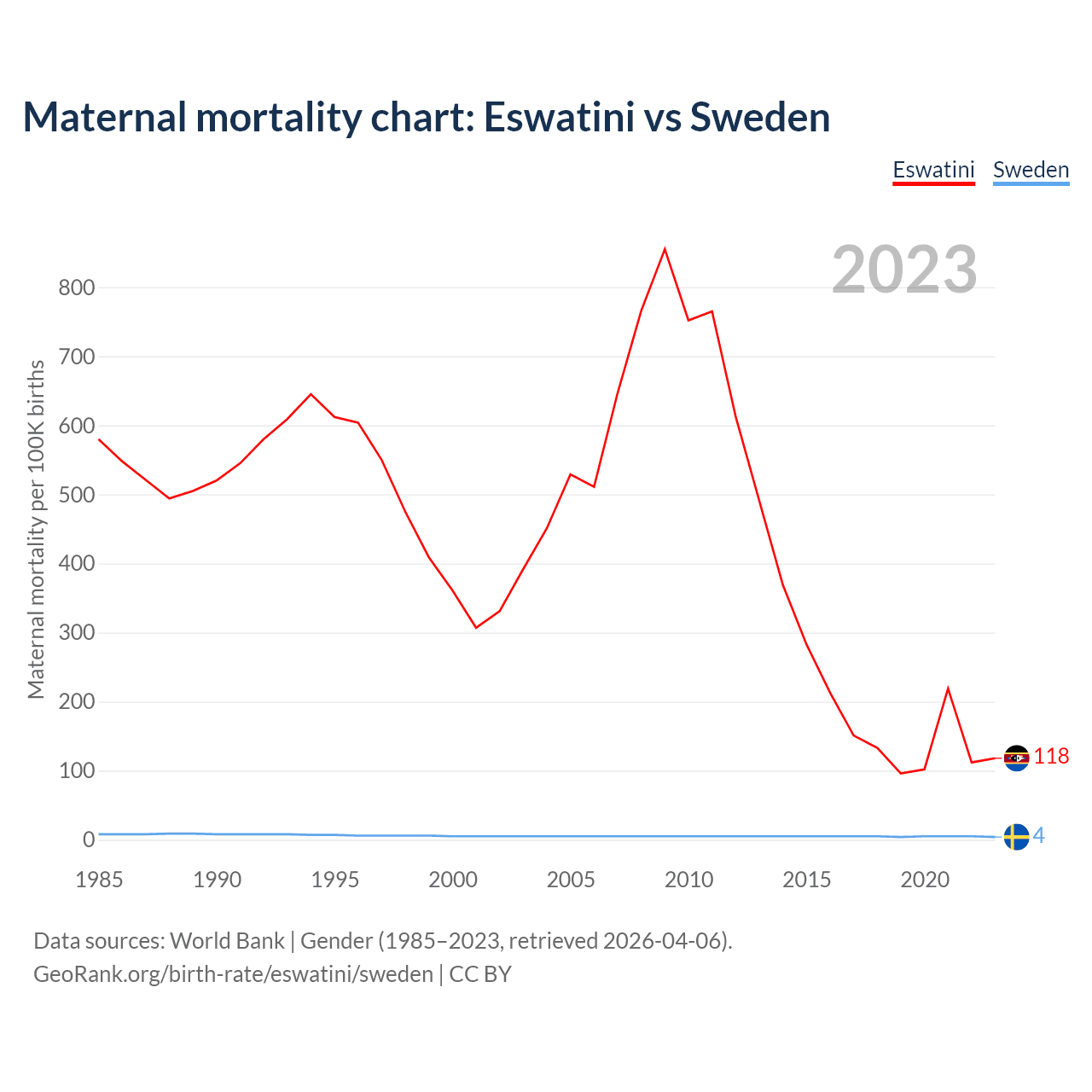 The maternal mortality rate, which is the probability of dying during childbirth or within 42 days of pregnancy termination, is 118 deaths per 100,000 live births in Eswatini, compared to 4 deaths in Sweden.